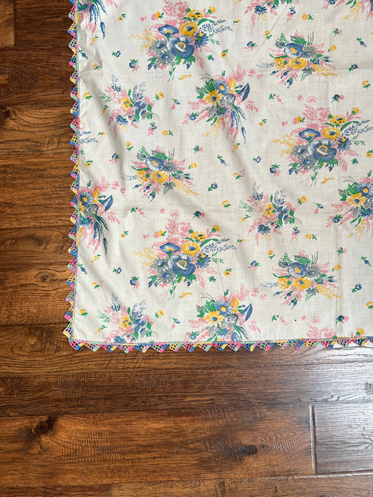 Vintage Linens - Square Tablecloth - Multicolor Flower Bouquets - Rainbow Crochet Edge - 36” X 36”