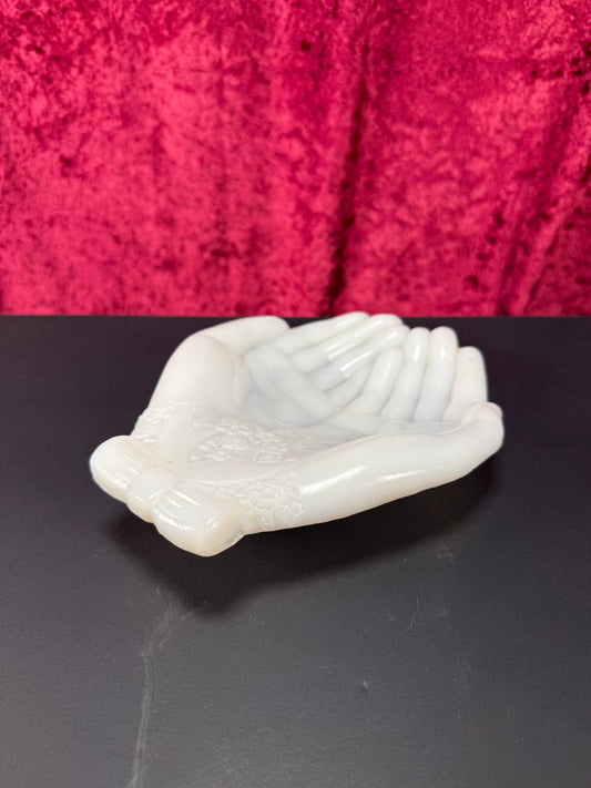 Vintage Trinket Dish - Cupped Open Hands - White Milk Glass - Avon