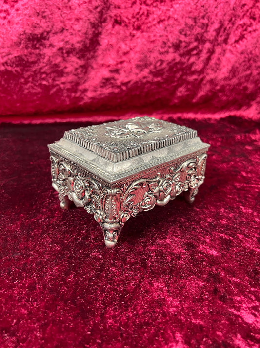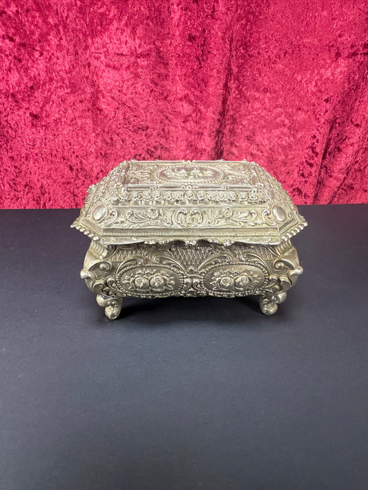 Vintage Vanity - Jewelry Box - Ornate Silver Floral Filigree - Red Velvet Lining - Footed