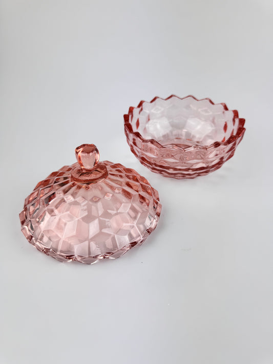 Vintage Whitehall Cubist Pattern Pink Glass Candy Dish with Lid