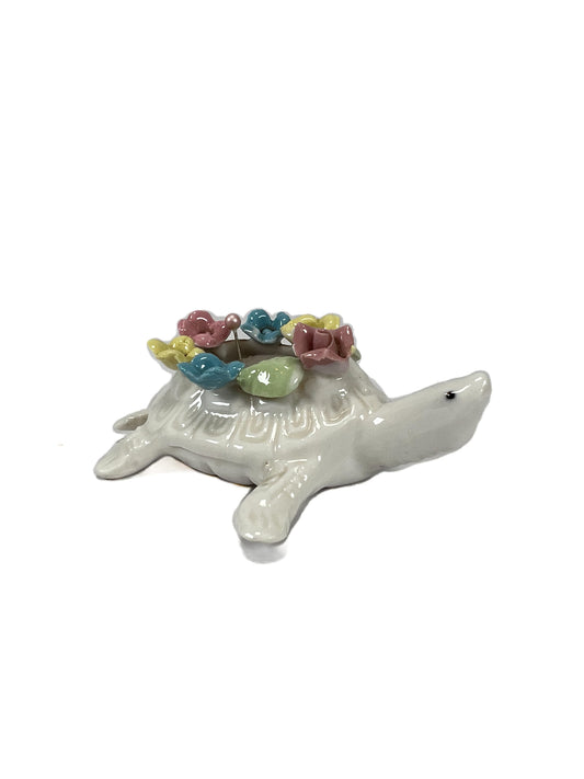 Vintage White Turtle Porcelain Pin Cushion - Blue Yellow Pink Flowers