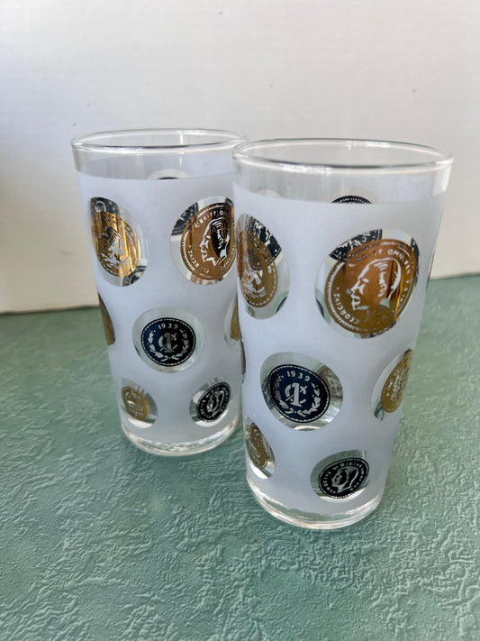 Libbey Tumblers - Frosted Glass with Gold Coins - Set of 2