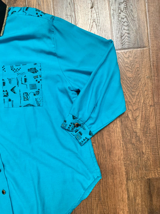 Vintage Clothing - Button Up Shirt - Turquoise & Black - Western Print - Sharon Anthony - Medium