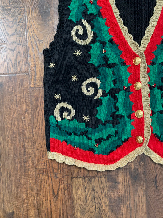 Vintage Clothing - Knit Button Up Vest - Holiday Mistletoe - Norton McNaughton - Medium