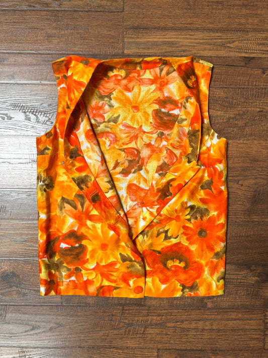 Vintage Clothing - Light Button Up Vest - Bright Orange Florals - Small