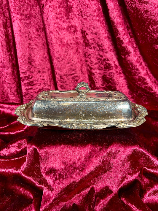 Vintage Kitchen - Covered Butter Dish - Silver Metal with Glass Insert - Ornate Edging