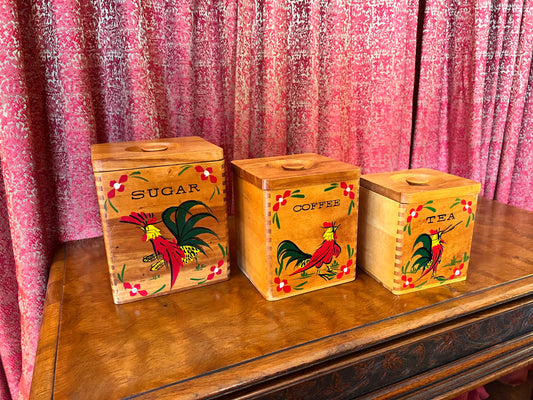 Vintage Kitchen - 1950s Wooden Rooster Canister Set - Coffee Sugar Tea