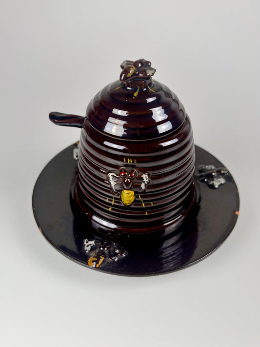 Vintage Lustreware Beehive Honey Pot & Plate | Dark Brown & Purple Glaze