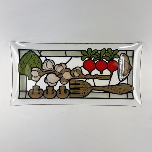 Vintage Rectangular Curved Glass Serving Tray w/ Vegetable Motif - Mid Century Modern Kitchen