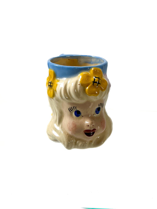 Vintage Decor - Klein & Co Girl Face Mug - Blue with Orange and Pink Flowers