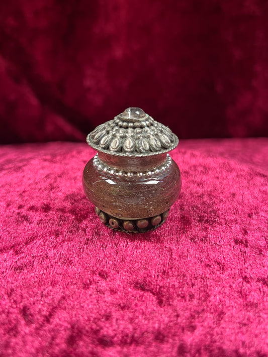 Vintage Trinket Box - Miniature Pill / Snuff Jar - Smokey Purple Glass - Ornate Silver Tone Design