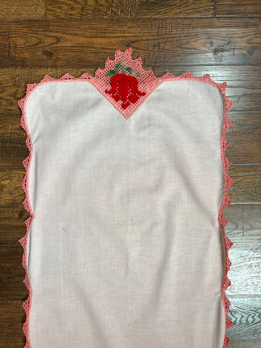 Vintage Linens - Table Runner with Lace Trim - Pink with Red Rose