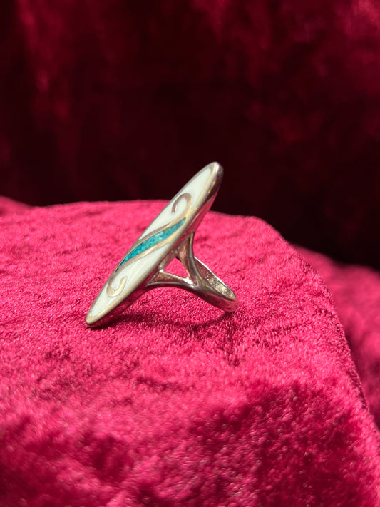 Vintage Jewelry - Marquise Ring - Sterling Silver - Turquoise Chip Inlay on White Stone - 8.5