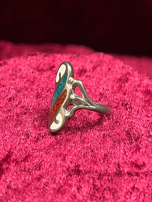 Vintage Jewelry - Ring - Sterling Silver - Turquoise and Coral Chip Inlay - 5