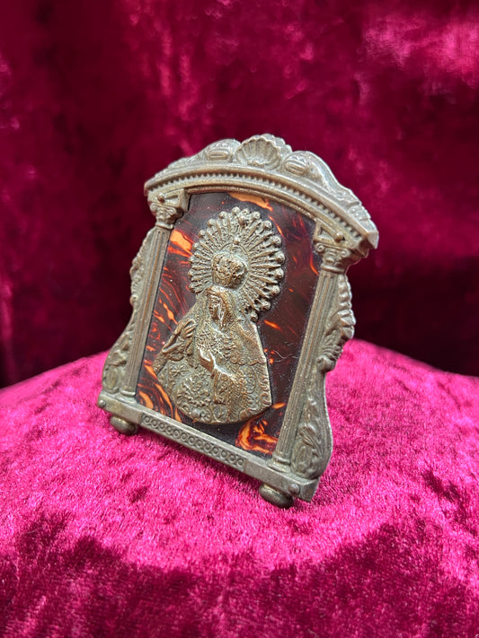 Vintage Religio - Framed Icon on Red Celluloid - Virgin Mary as Queen - 2.5" X 2"