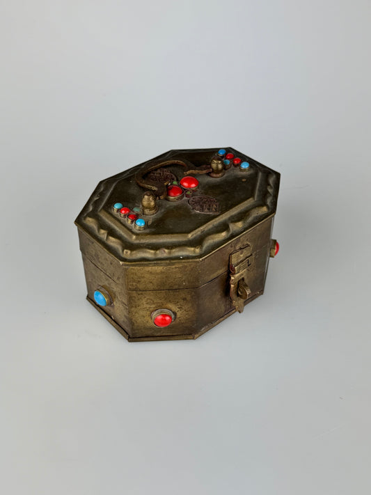 Vintage Hinged Brass Jeweled Trinket Box w/ Handle - Lockable