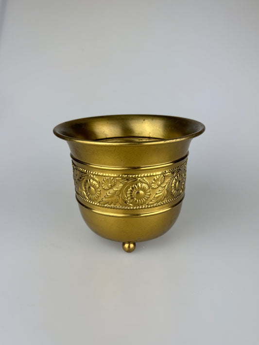 Vintage Footed Brass Cachepot with Floral Daisy Repoussé Decoration