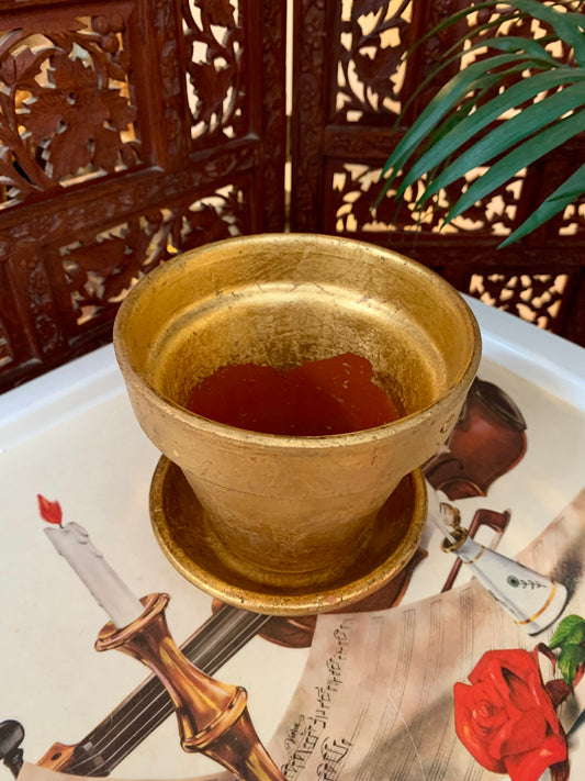 Vintage Pottery Barn Deroma Gilt Terracotta Pot and Saucer - Made In Italy - 5”