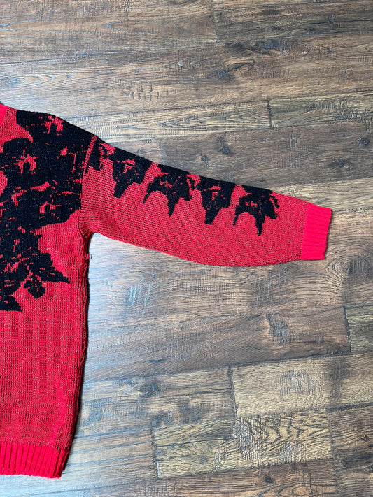 Vintage Clothing - Pullover Crewneck Knit Sweater - Black Flowers on Red Glitter - Medium