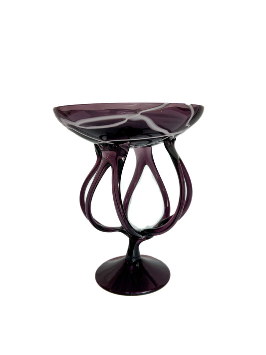 Vintage Art Glass - Jellyfish Pedestal Bowl - Amethyst and White - Makora - Made In Poland