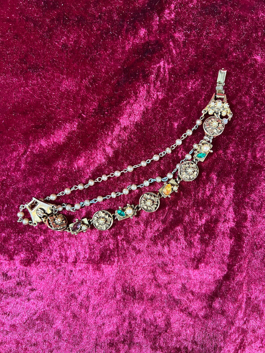 Vintage Jewelry - 3-Strand Charm Bracelet - Gold Tone - Multicolor Rhinestones - Goldette NY