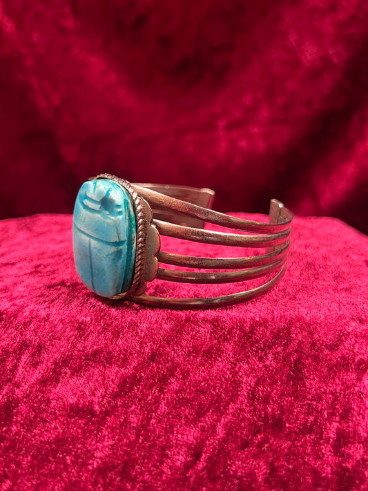 Vintage Jewelry - Chunky Cuff Bracelet - Egyptian Revival Blue Scarab