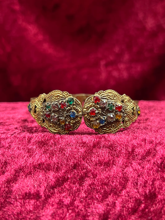 Vintage Jewelry - Hinged Bangle Bracelet - Multicolor Rhinestones in Ornate Brass Setting