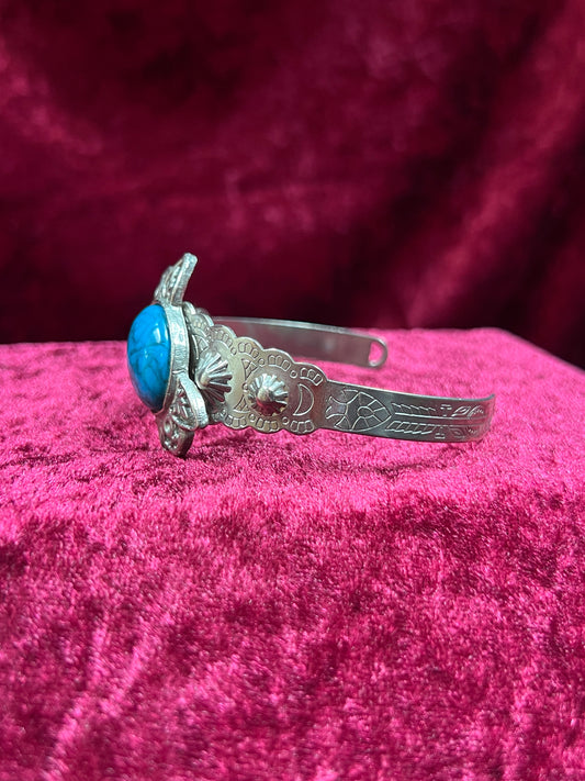 Vintage Jewelry - Cuff Bracelet - Engraved Silver Tone Metal - Faux Turquoise Center