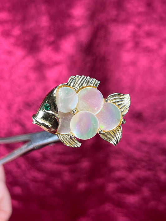 Vintage Jewelry - Brooch - Gold Tone Fish - Green Rhinestone Eye - Mother of Pearl Scales