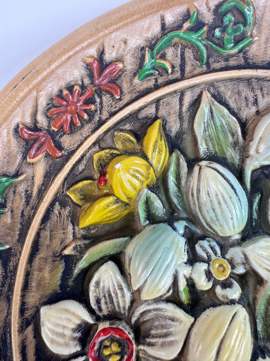 Vintage Chalkware Wall Hanging Art - 1970s 3D Floral Relief - Napcoware Japan