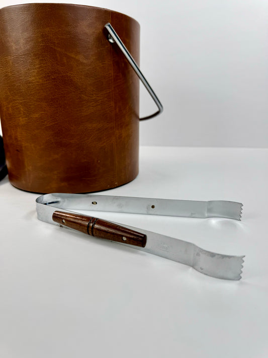 Vintage MCM Ice Bucket - Brown with Black Lid and Ice Tongs
