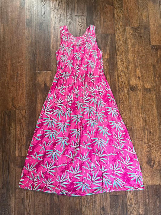 Vintage Clothing - Sleeveless Maxi Sun Dress - Hot Pink - Teal Tropical Leaves - Medium - Anthony Richards