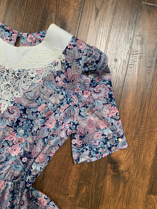 Vintage Clothing - Belted Shirt Dress - Purple & Blue Florals - Lace Yoke - Whirlaway Frocks - Made In U.S.A. - Medium