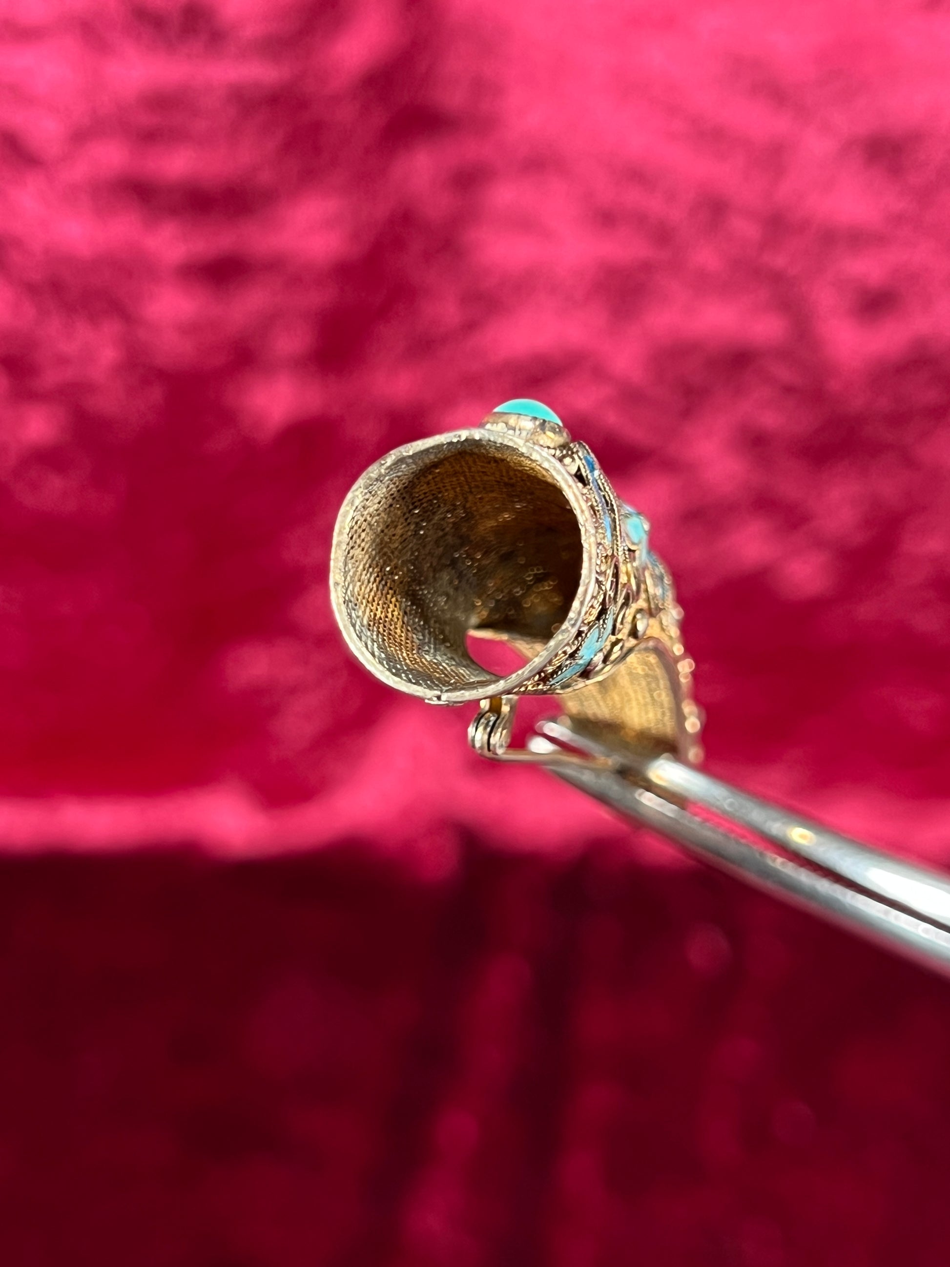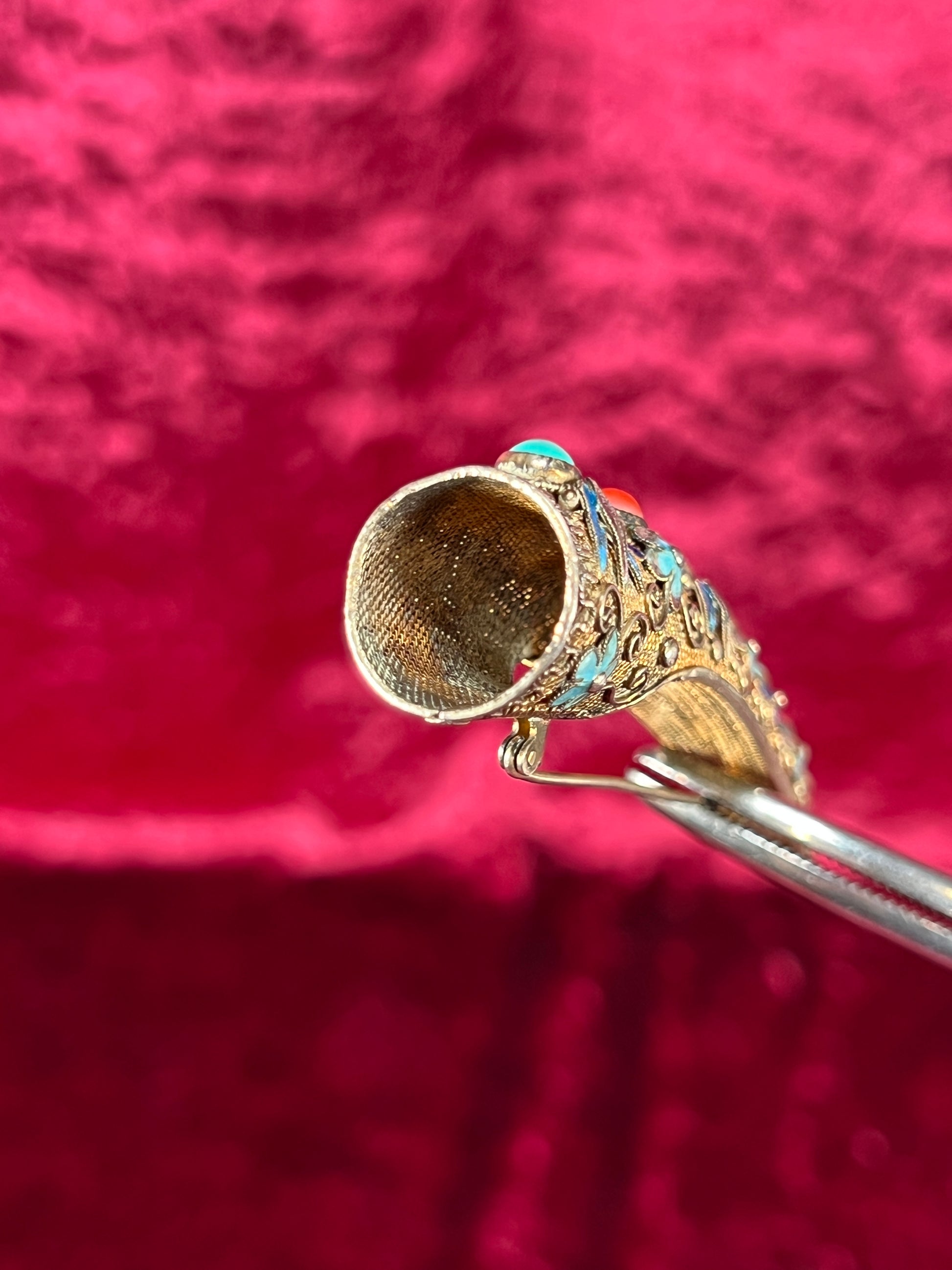 Antique Jewelry - Brooch - Chinese Finger Nail Guard - Plated Sterling Silver, Turquoise, Coral, and Enamel