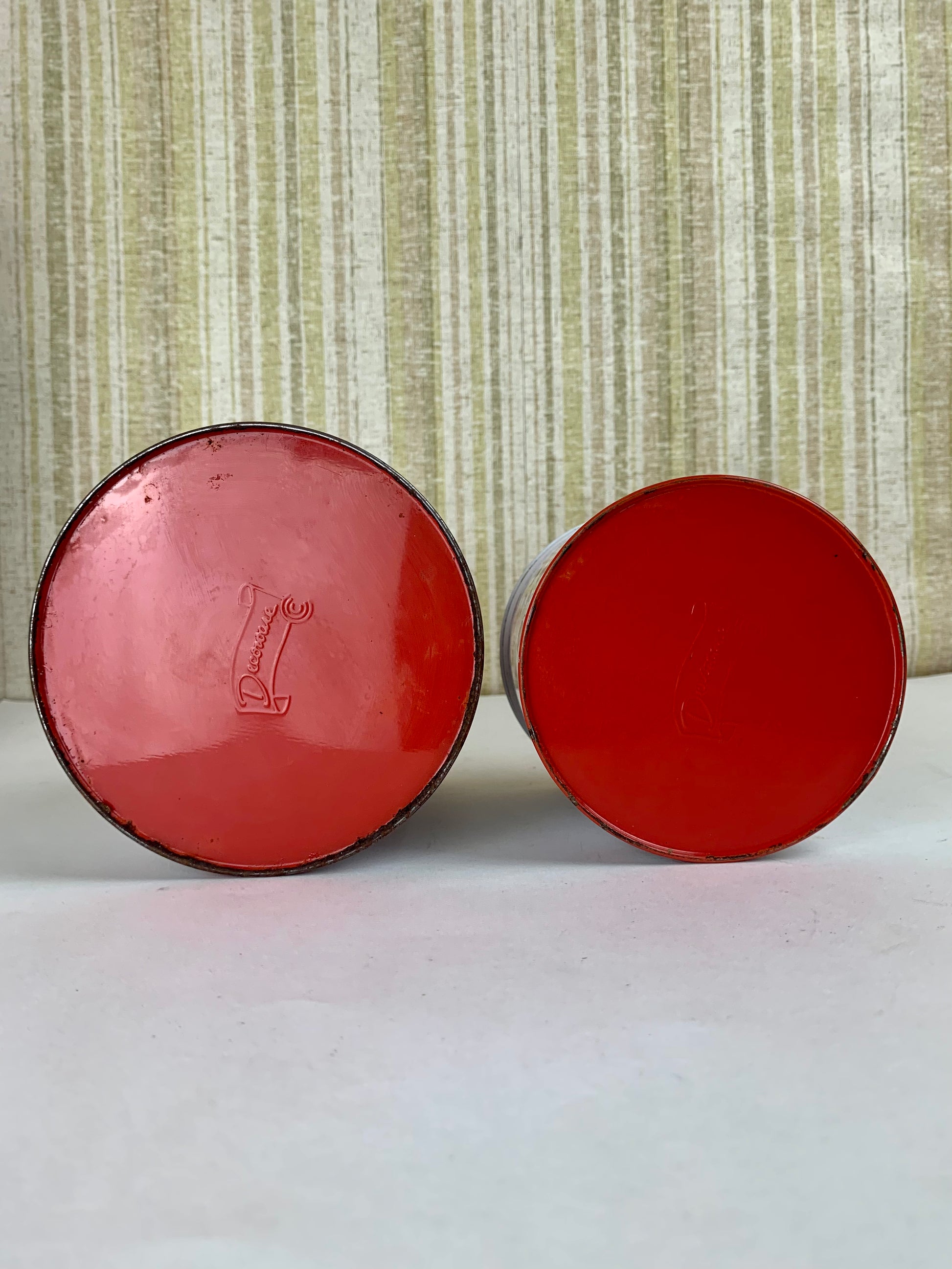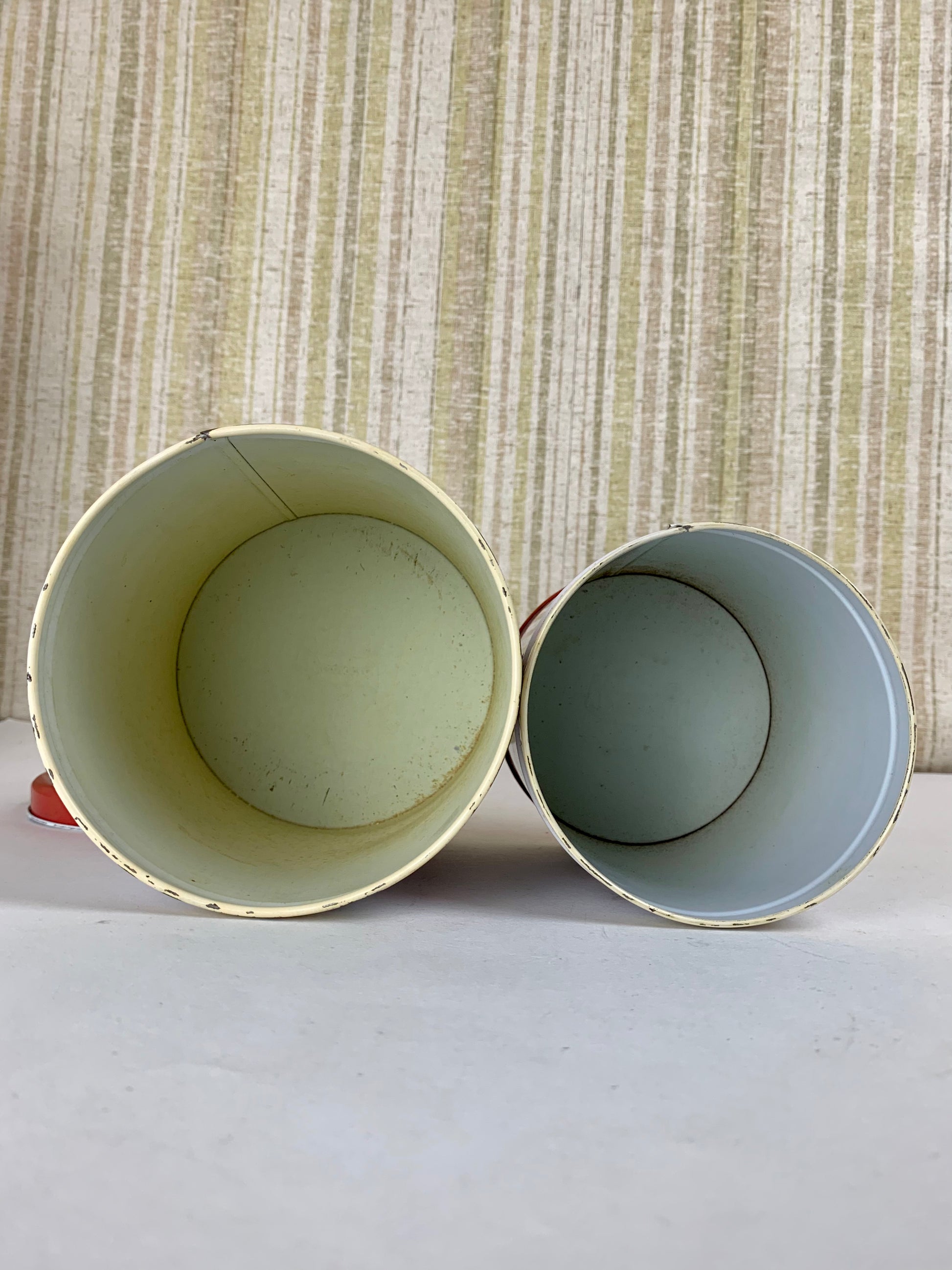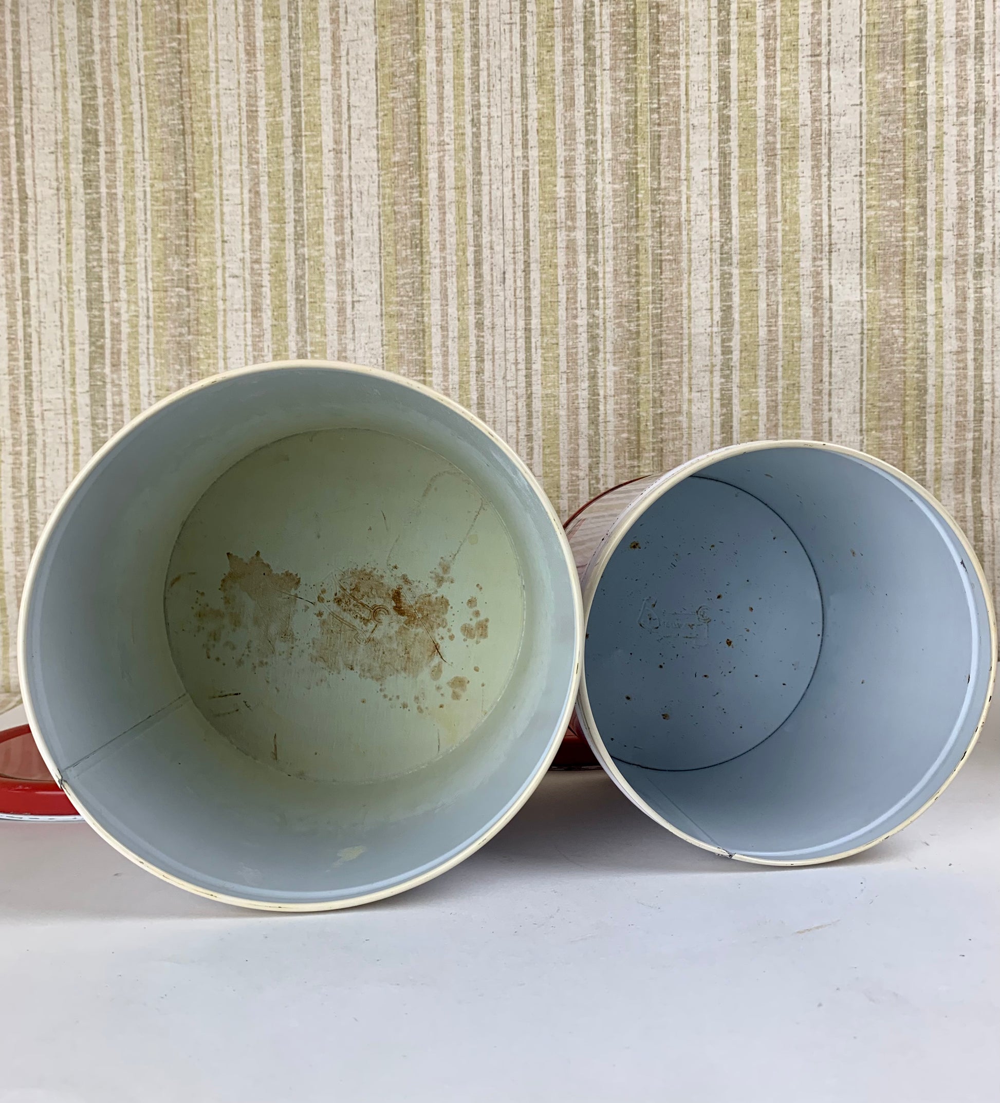 Perfect for storing your things in style, these Decoware canisters are some of the prettiest we've ever seen! Due to age they have some scratching, staining, and rust spots on all canisters. There's a minor dent on the lid of the smallest canister. Largest measures 7 1/2" by 7". Medium 6 1/2" by 6". Small 5 3/4" by 5". XS 5" by 4 1/4".
