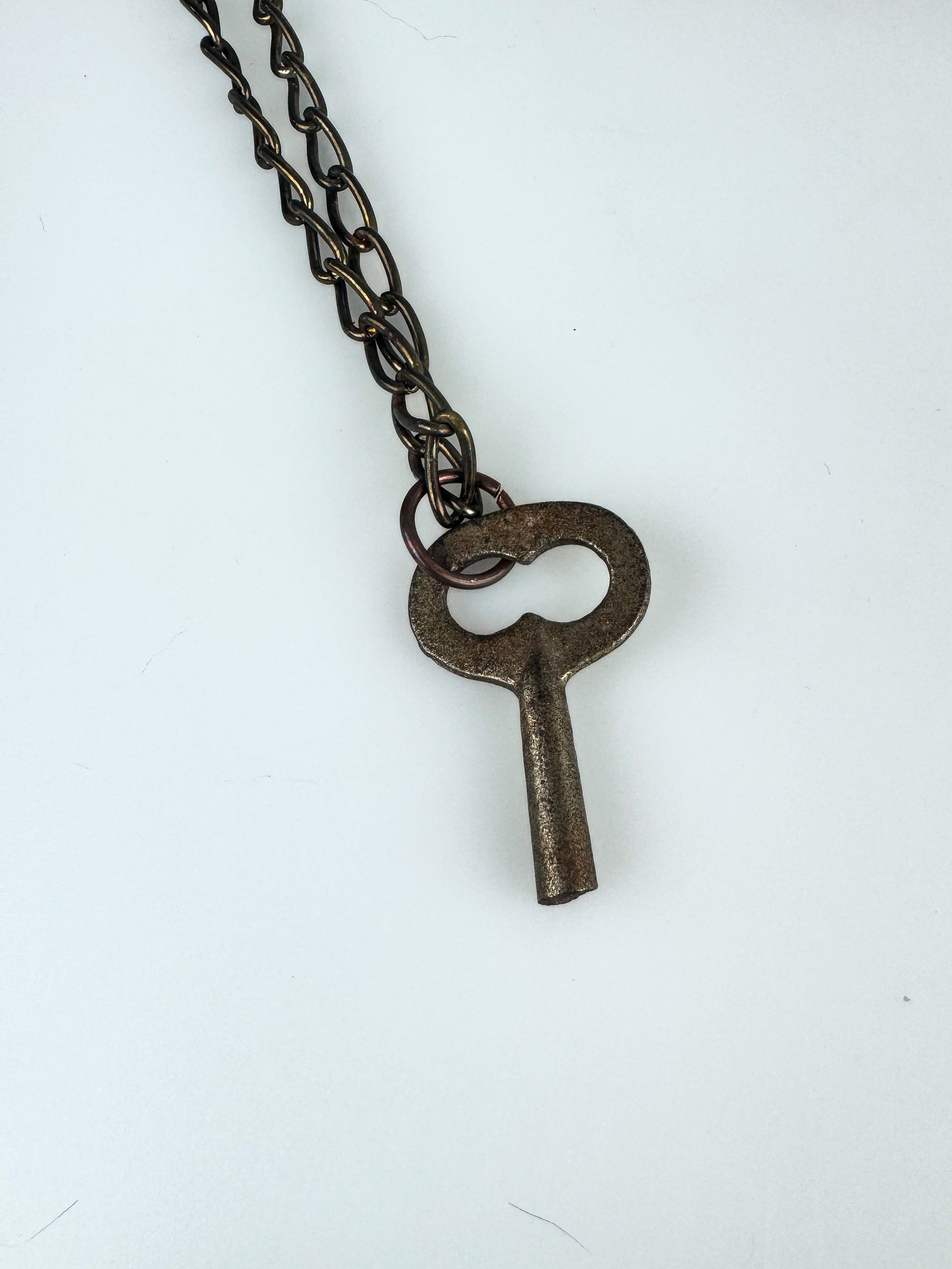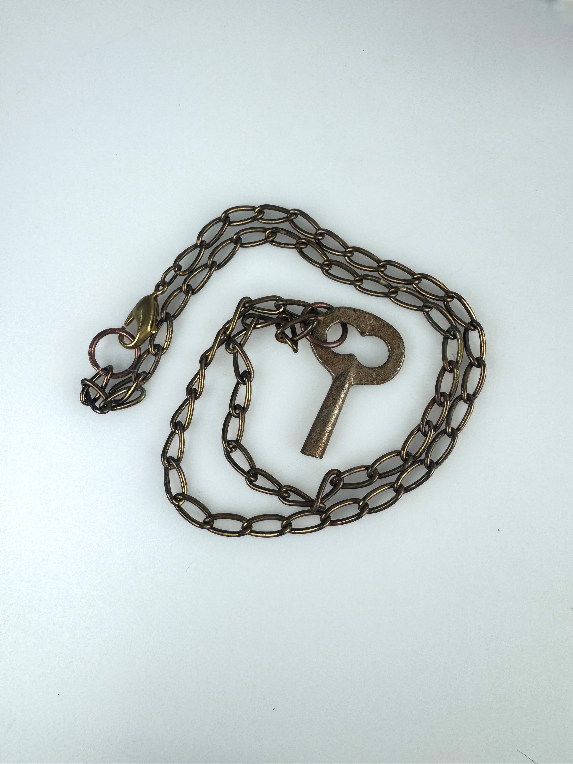 This 23" classic half broken skeleton key hangs from a simple copper ring. The open-weave brass chain is the perfect weight for this piece. Note the larger clasp for easier removal.