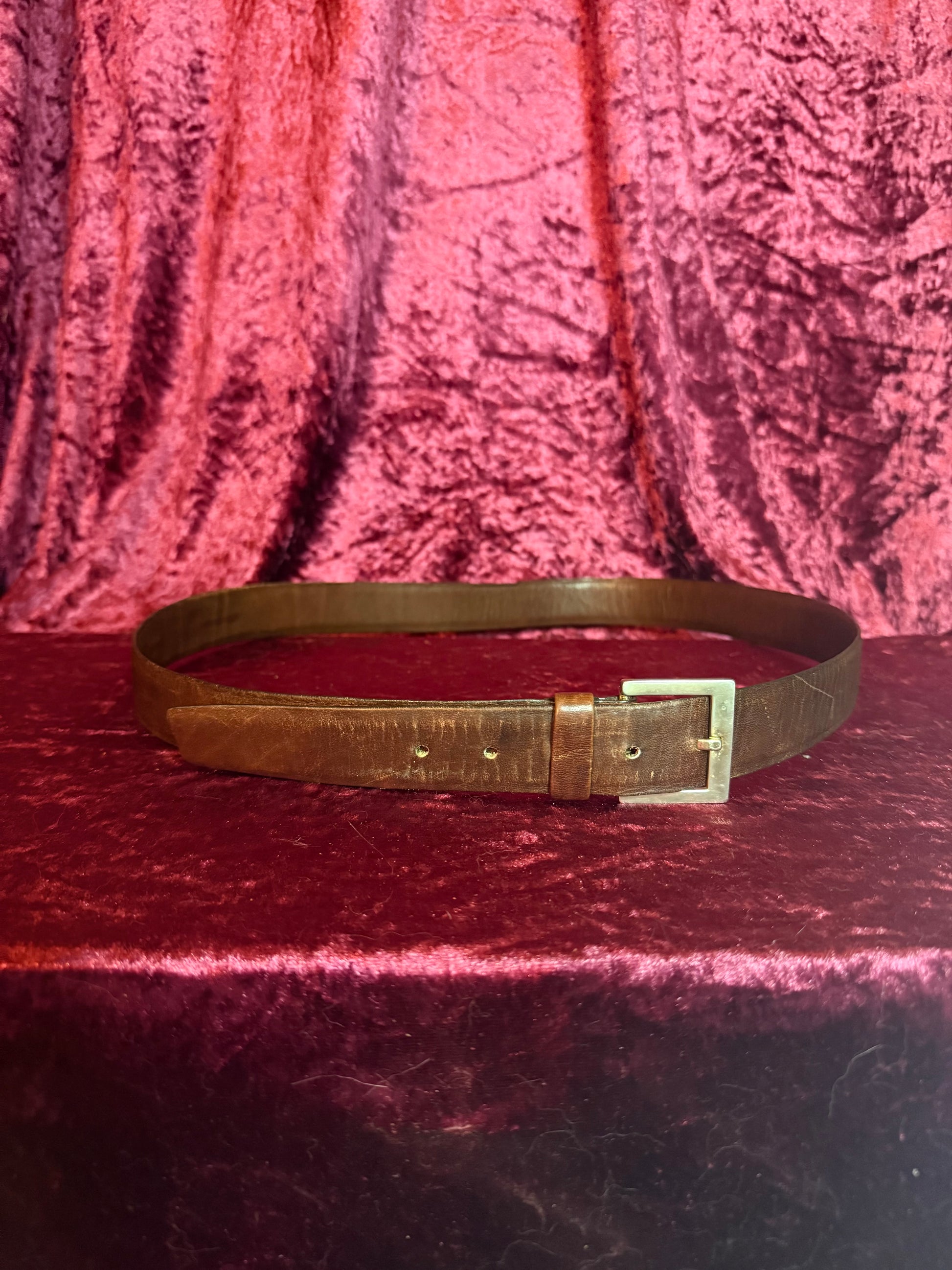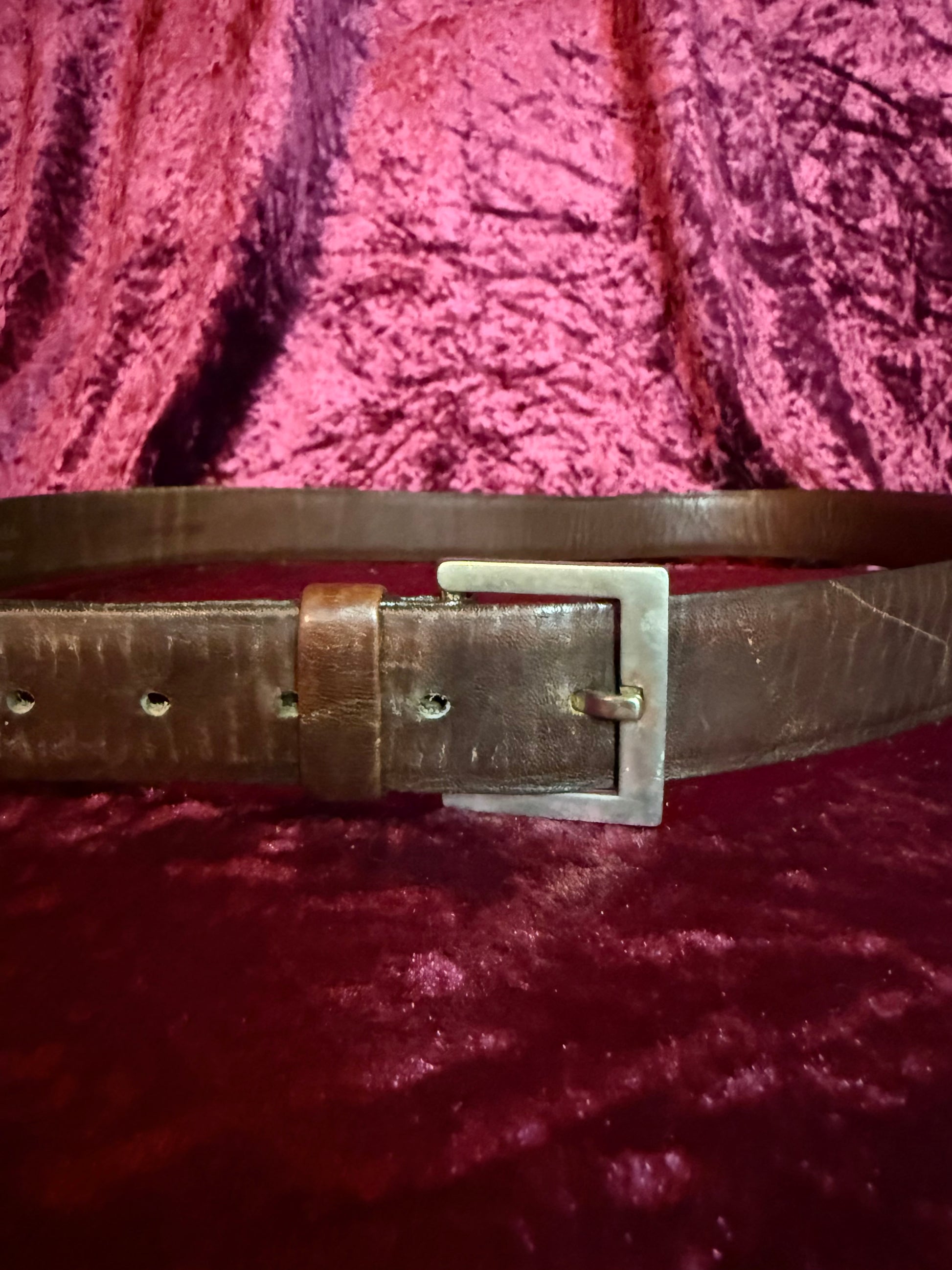 Harris California brown glove leather belt. Silver and brass buckle.