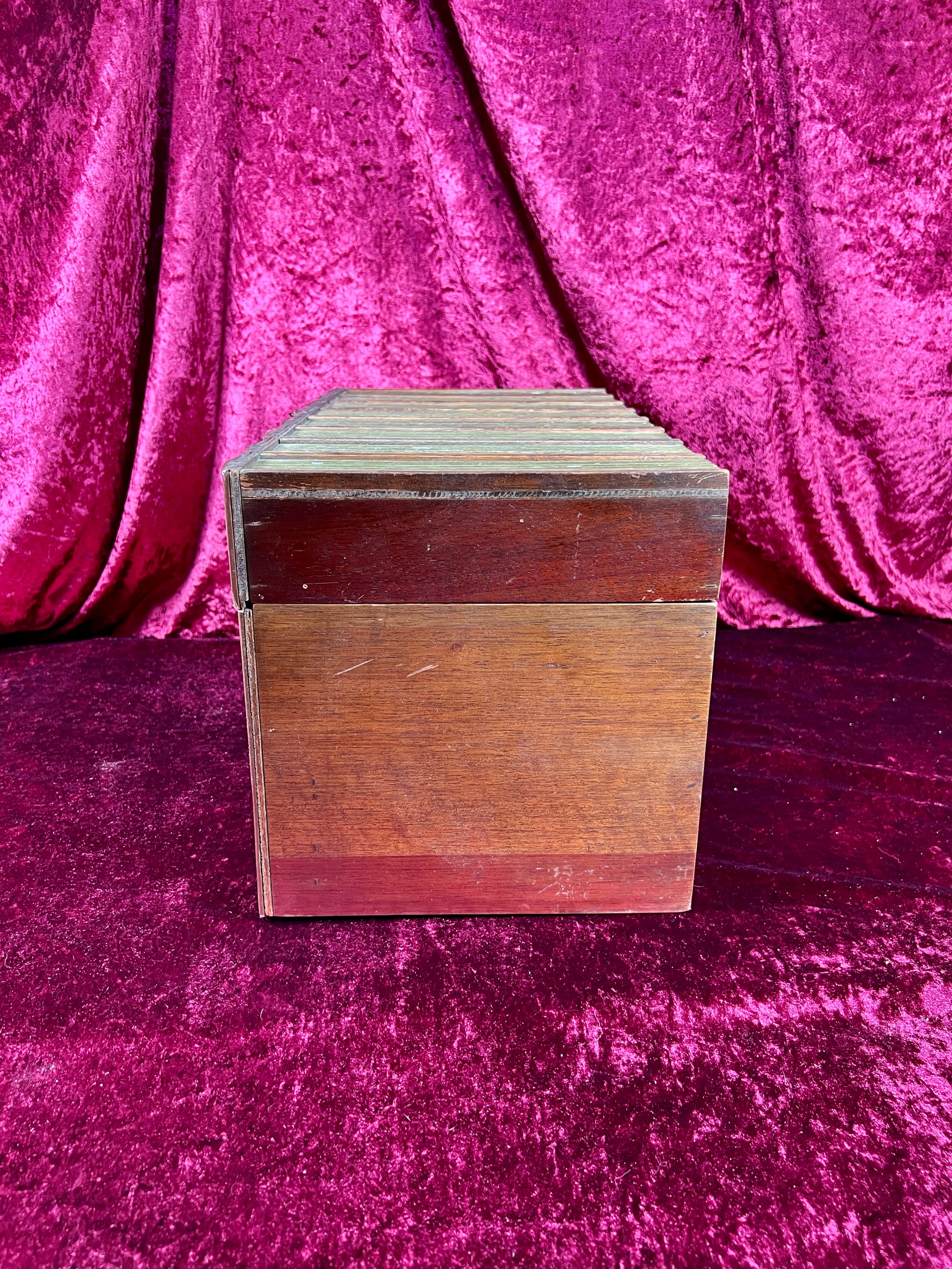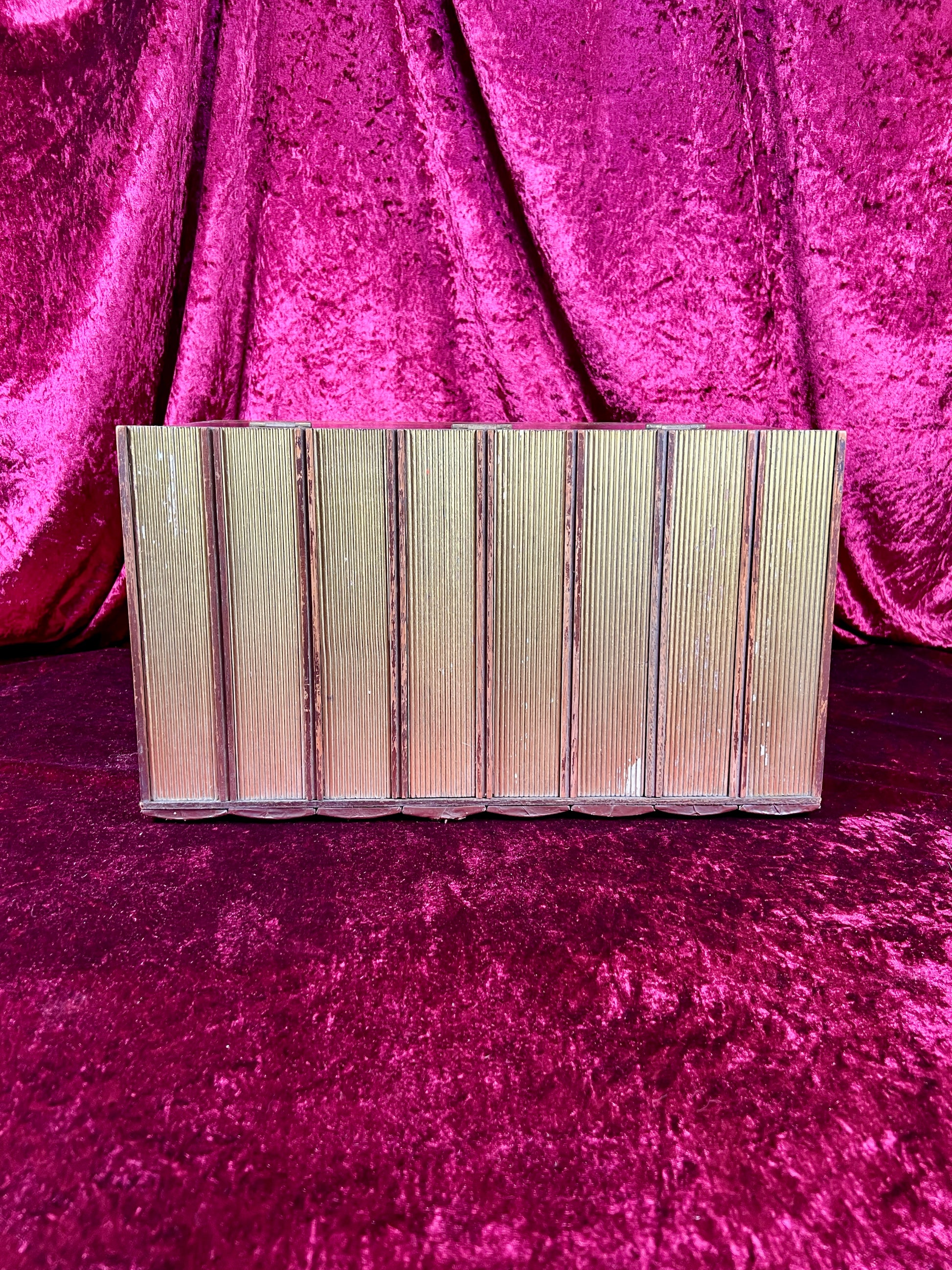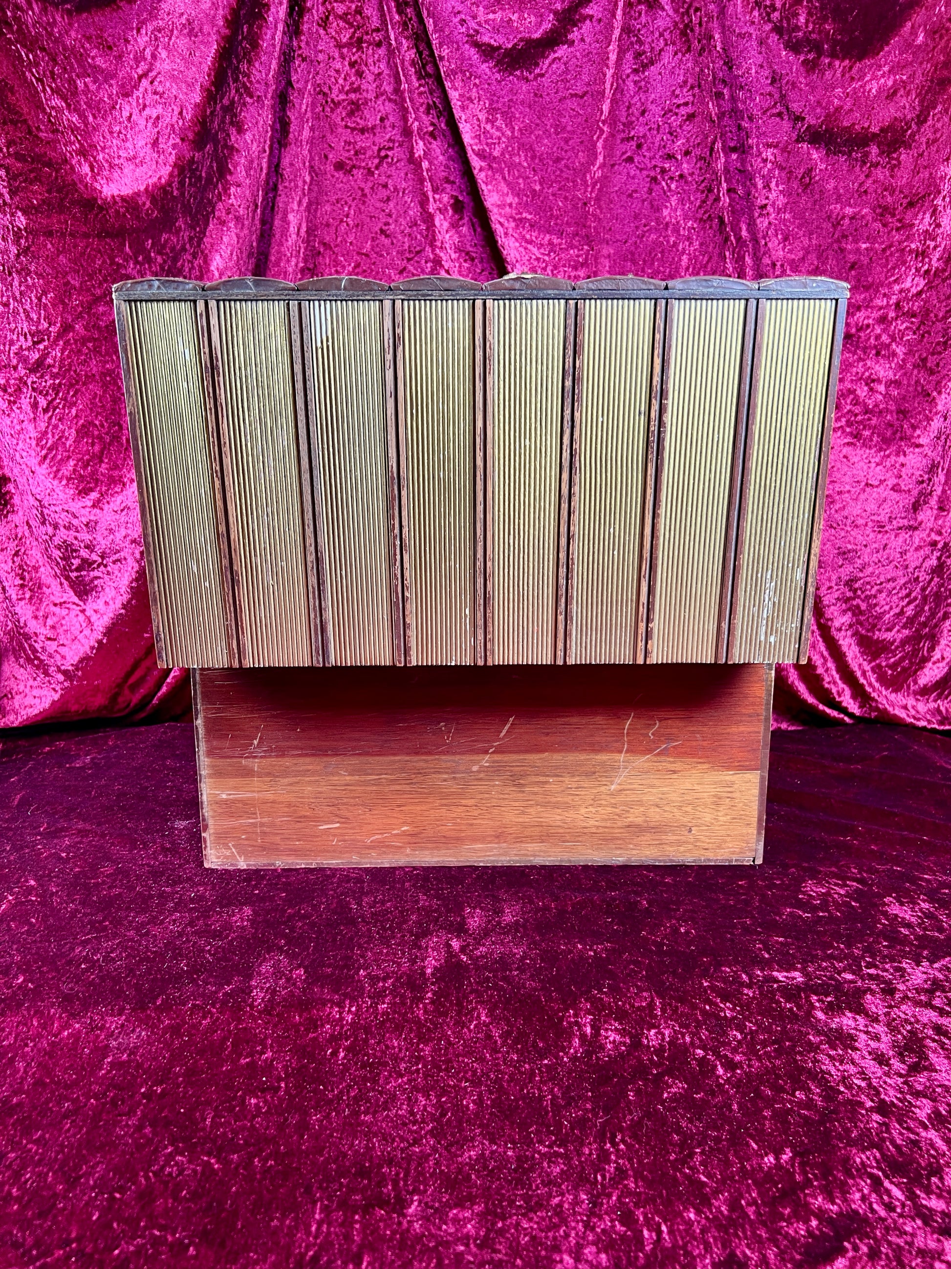 Condition: This item is structurally sound. Cosmetically there is scratching and wear on the outer surfaces. The wood veneer is chipped in a few places. The leather on the front is scratched and has some chunks missing towards the bottom. The gold leafing on the book "pages" is worn in multiple places. See pictures.