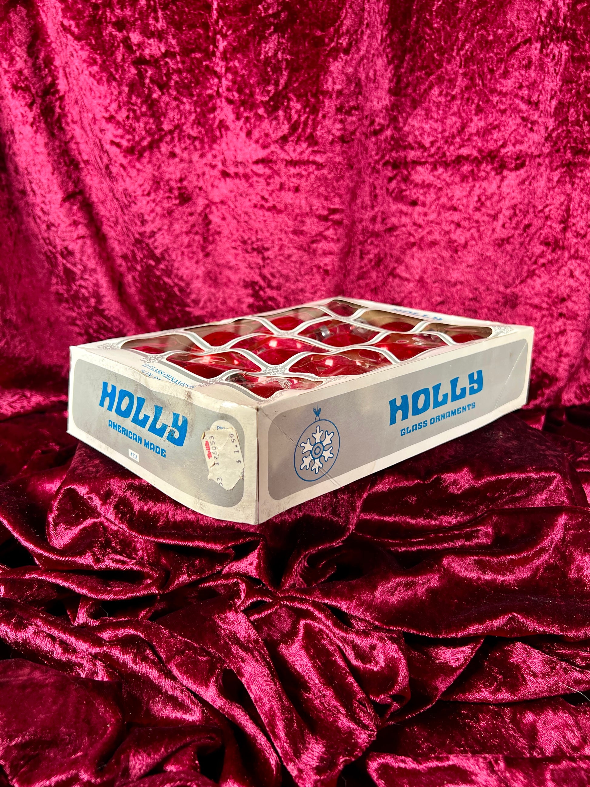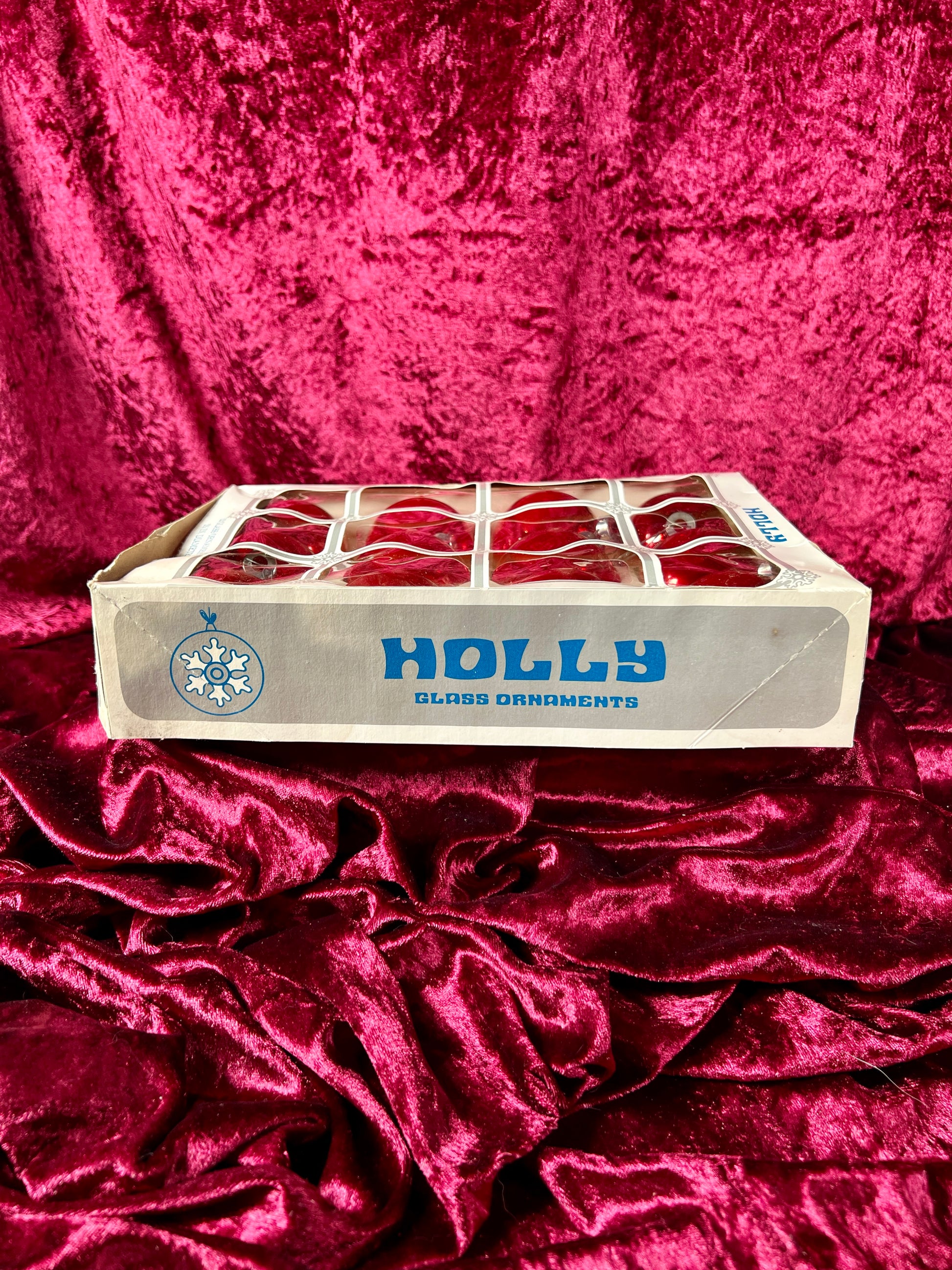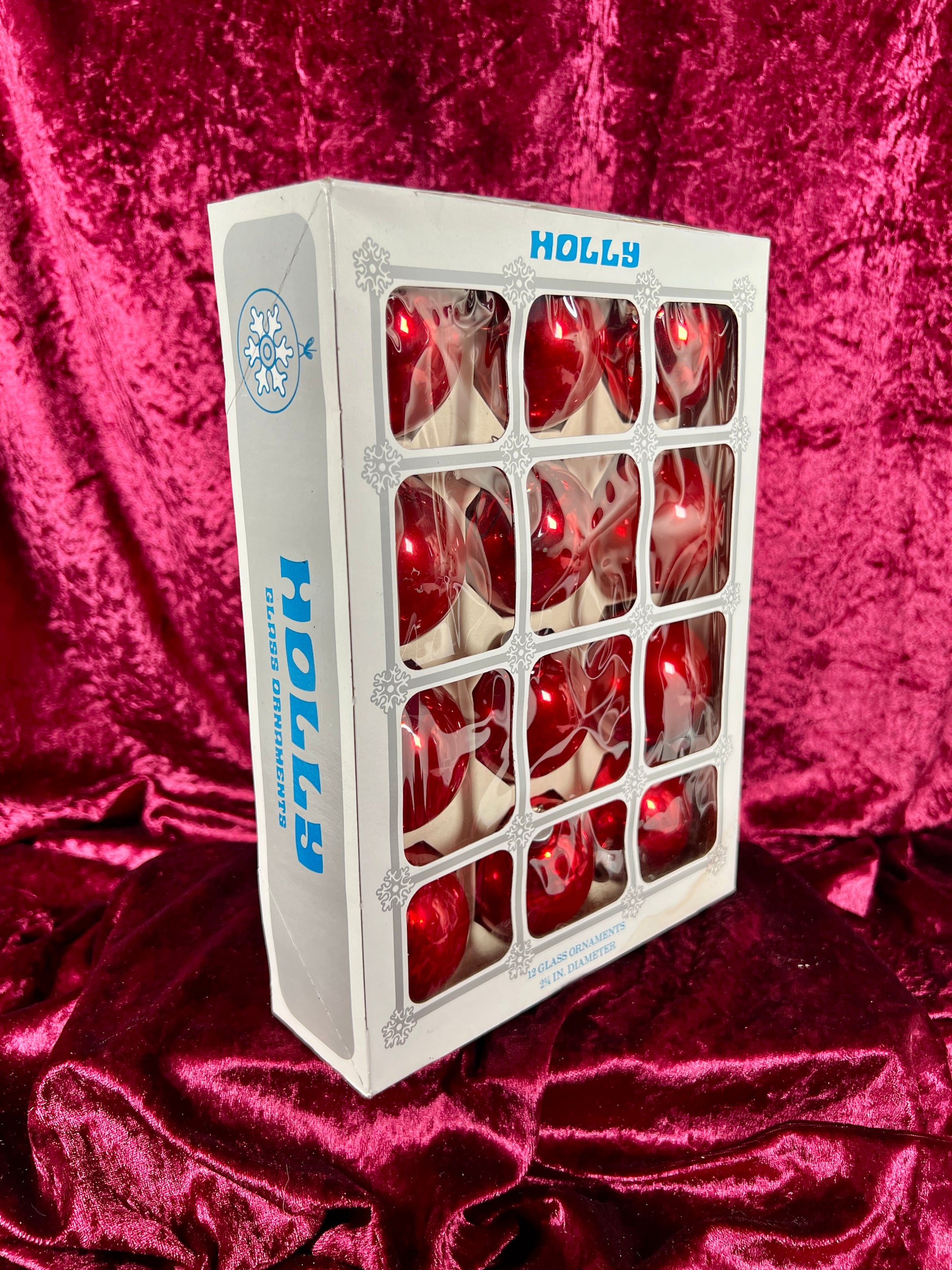Vintage Christmas - Glass Ornament Set of 12 - Solid Red - Holly - Made In USA