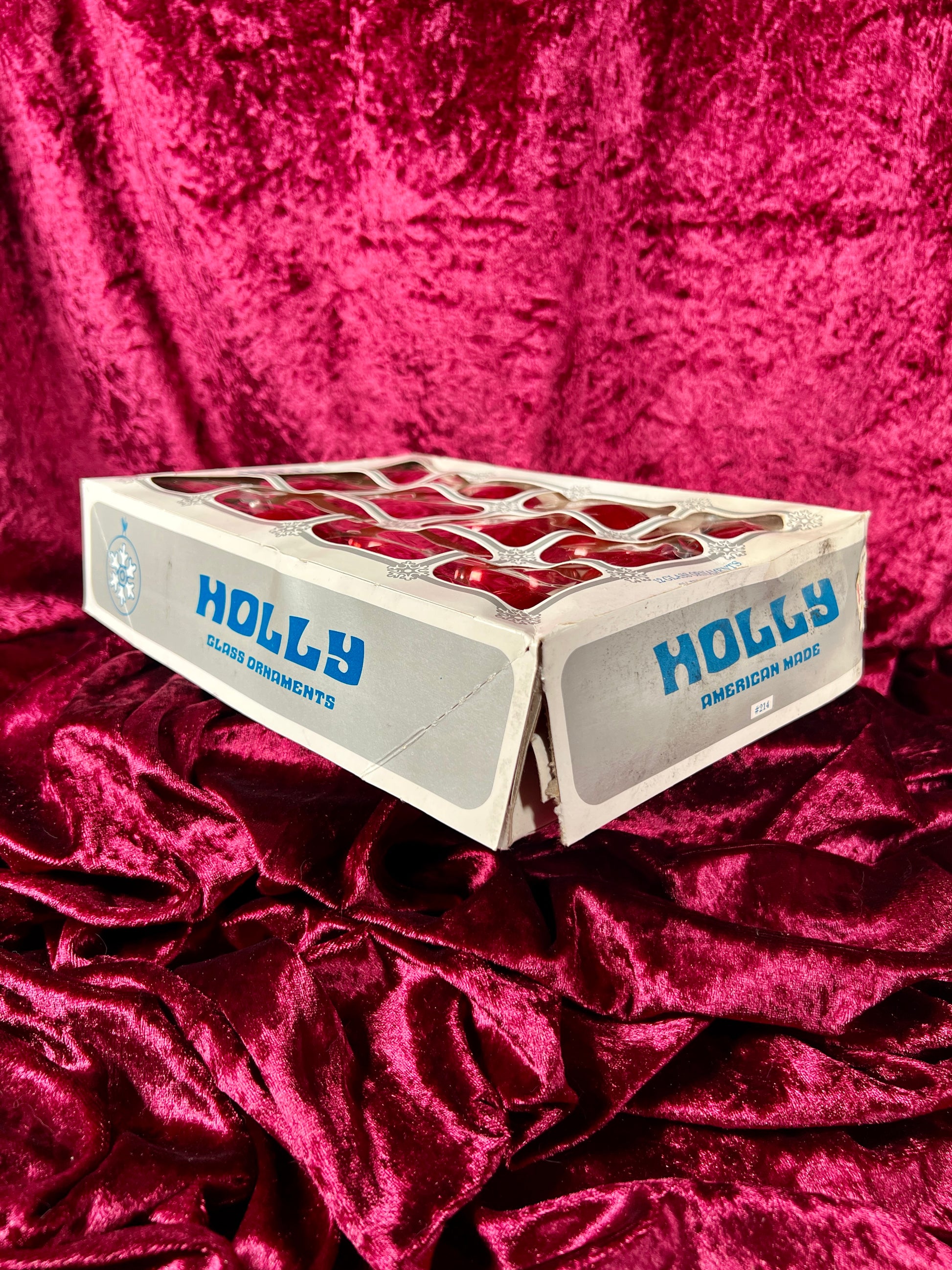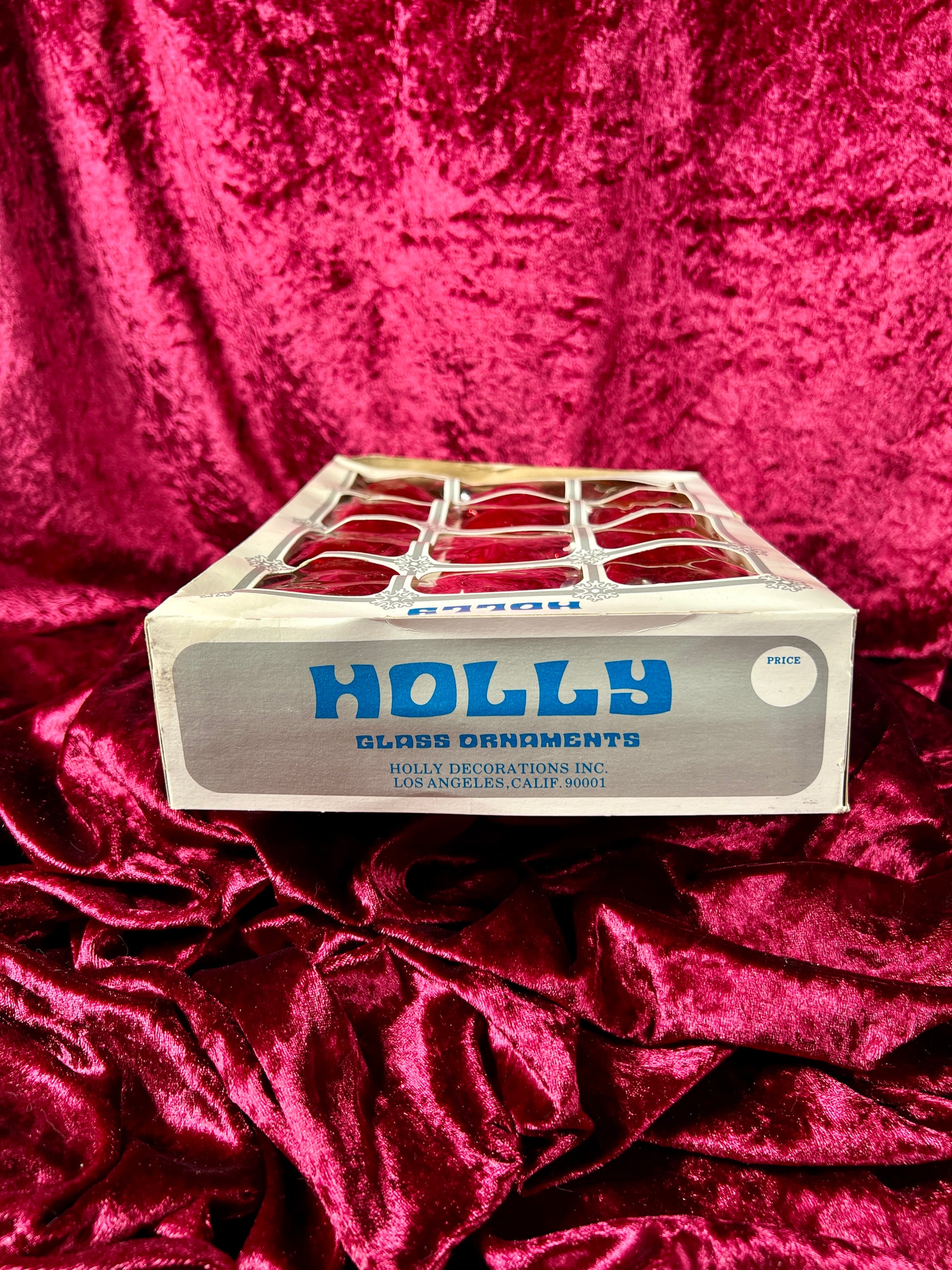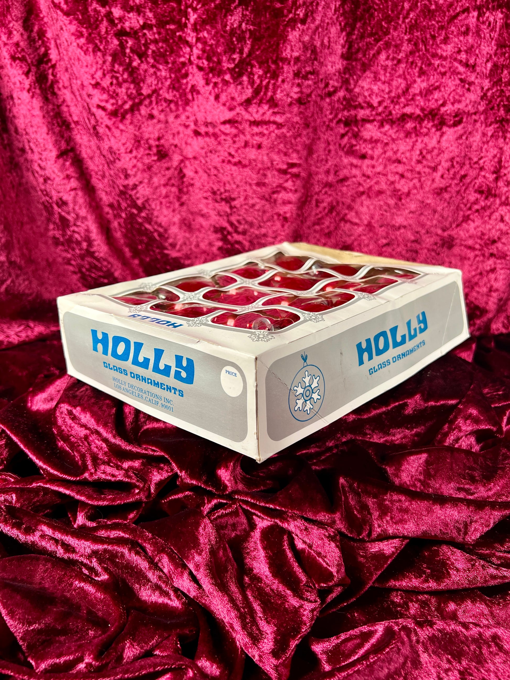 Vintage Christmas - Glass Ornament Set of 12 - Solid Red - Holly - Made In USA