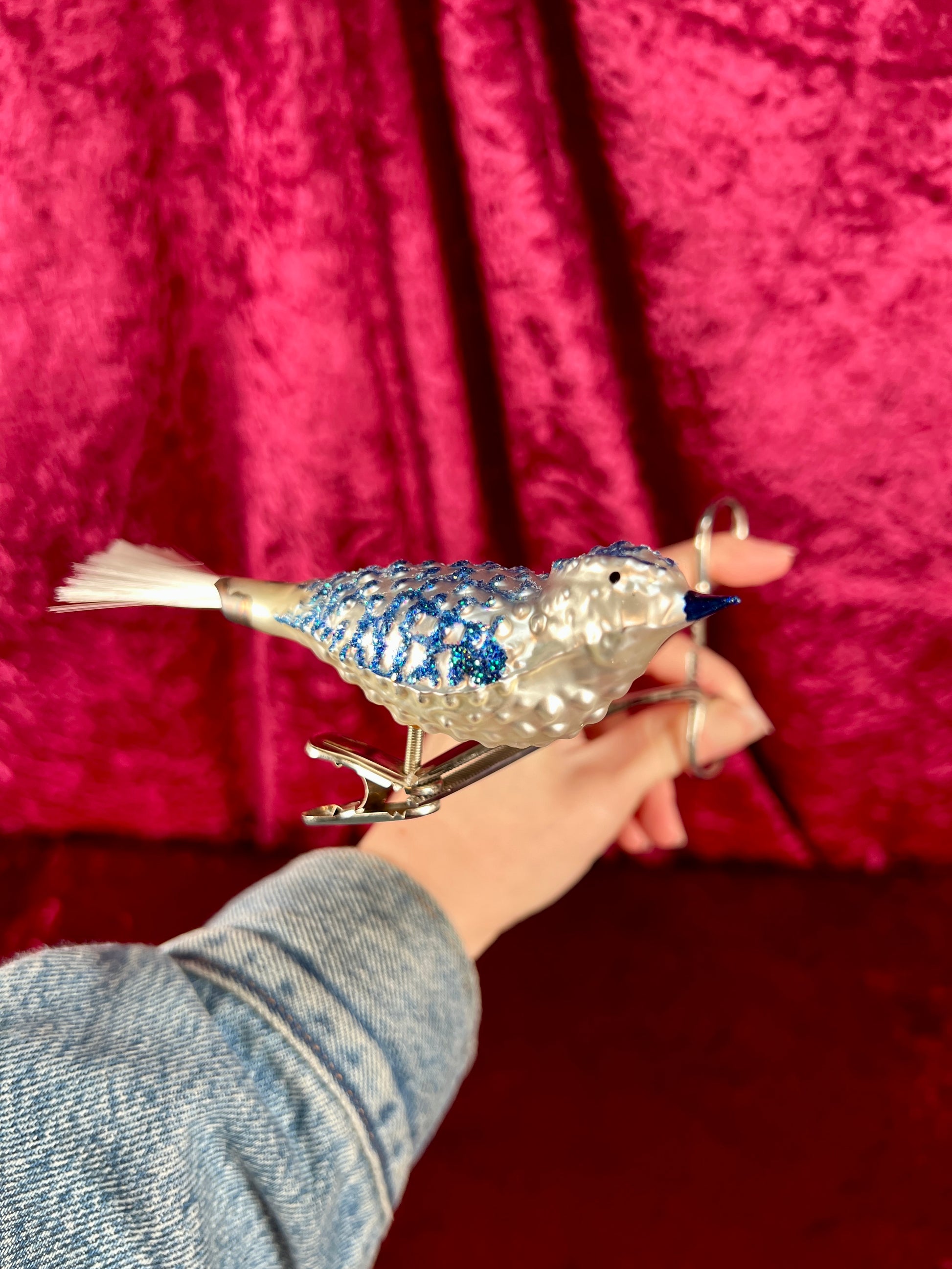 Vintage Christmas - Handblown Glass Clip On Ornament - Blue Bird with Nylon Hair Tail