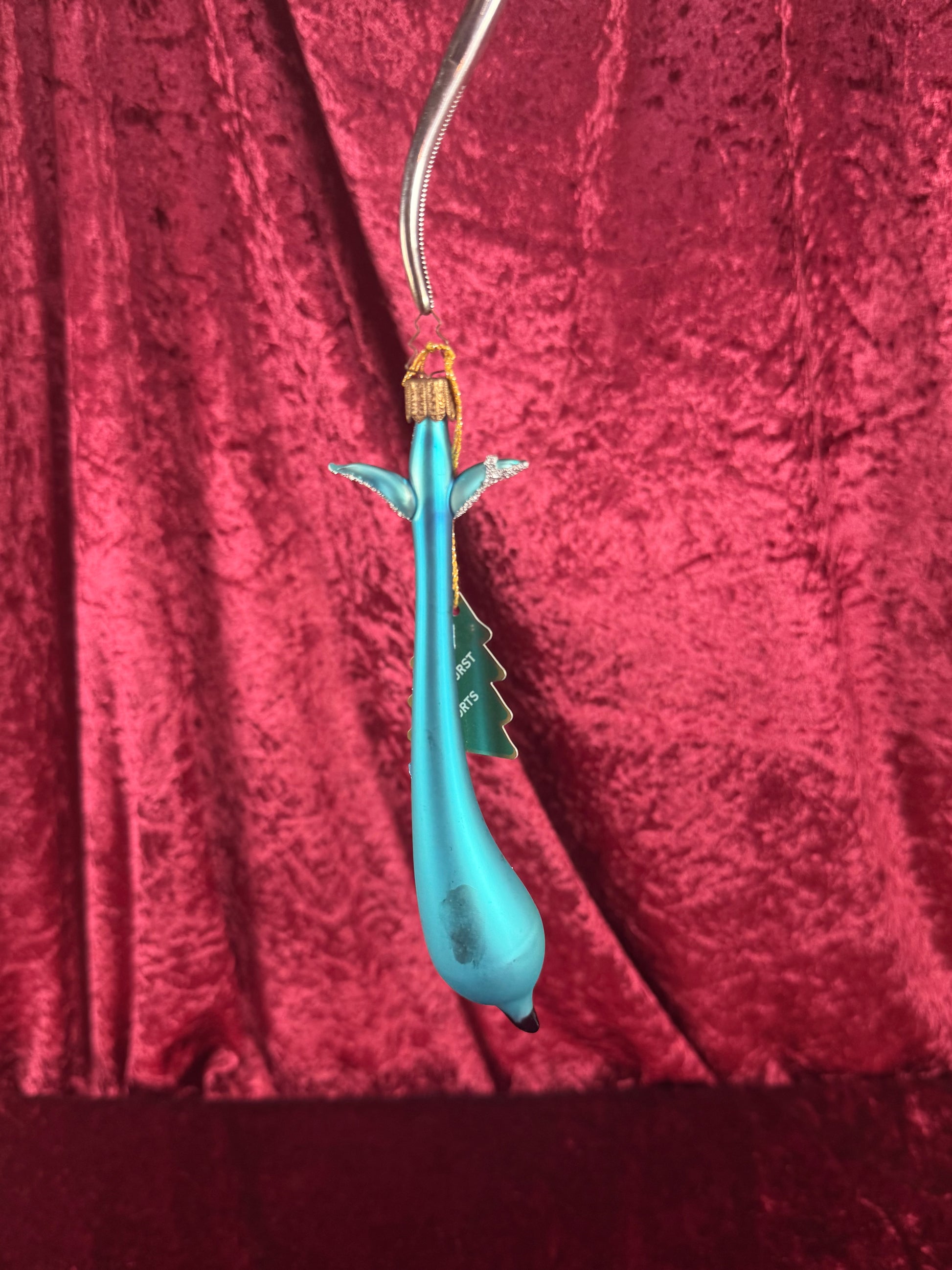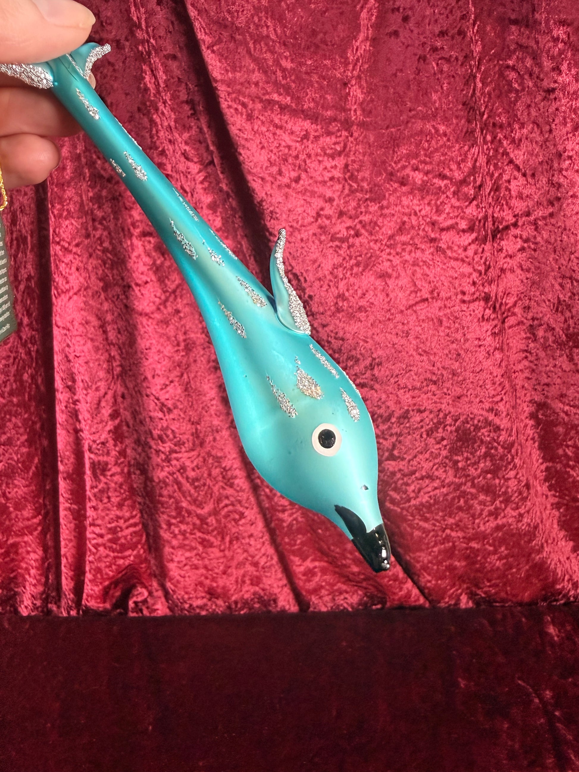 Vintage Christmas - Handblown Glass Ornament - Blue Dolphin with Silver Glitter - Whitehurst Imports