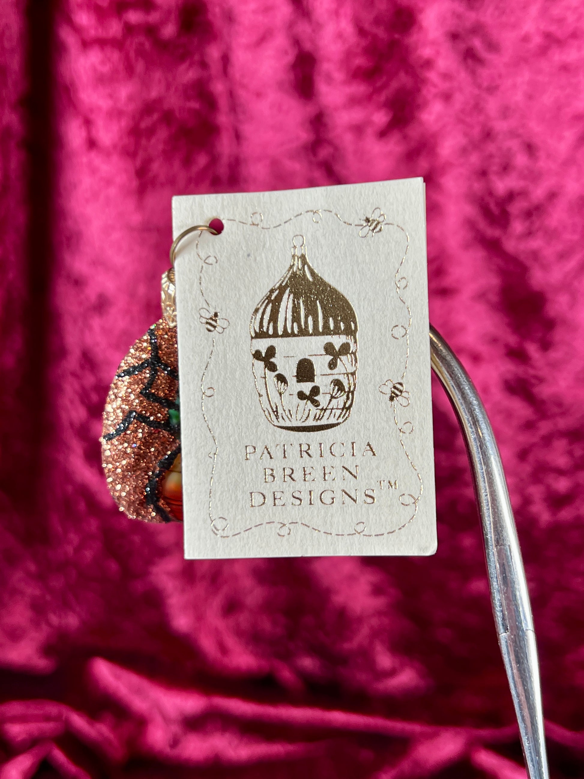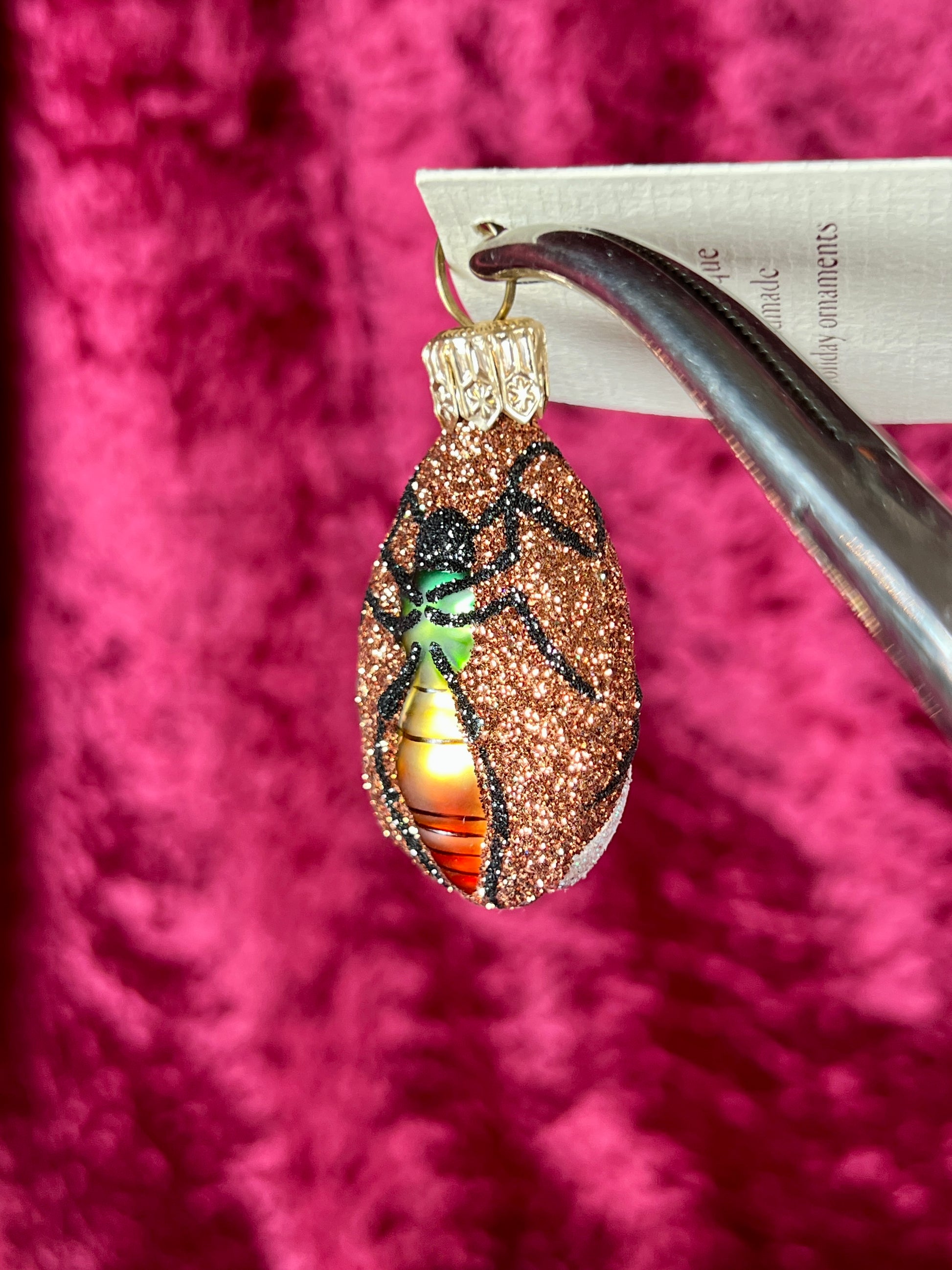 Vintage Christmas - Handblown Glass Ornament - Flying Insect - Green / Yellow on Orange Glitter - Patricia Breen