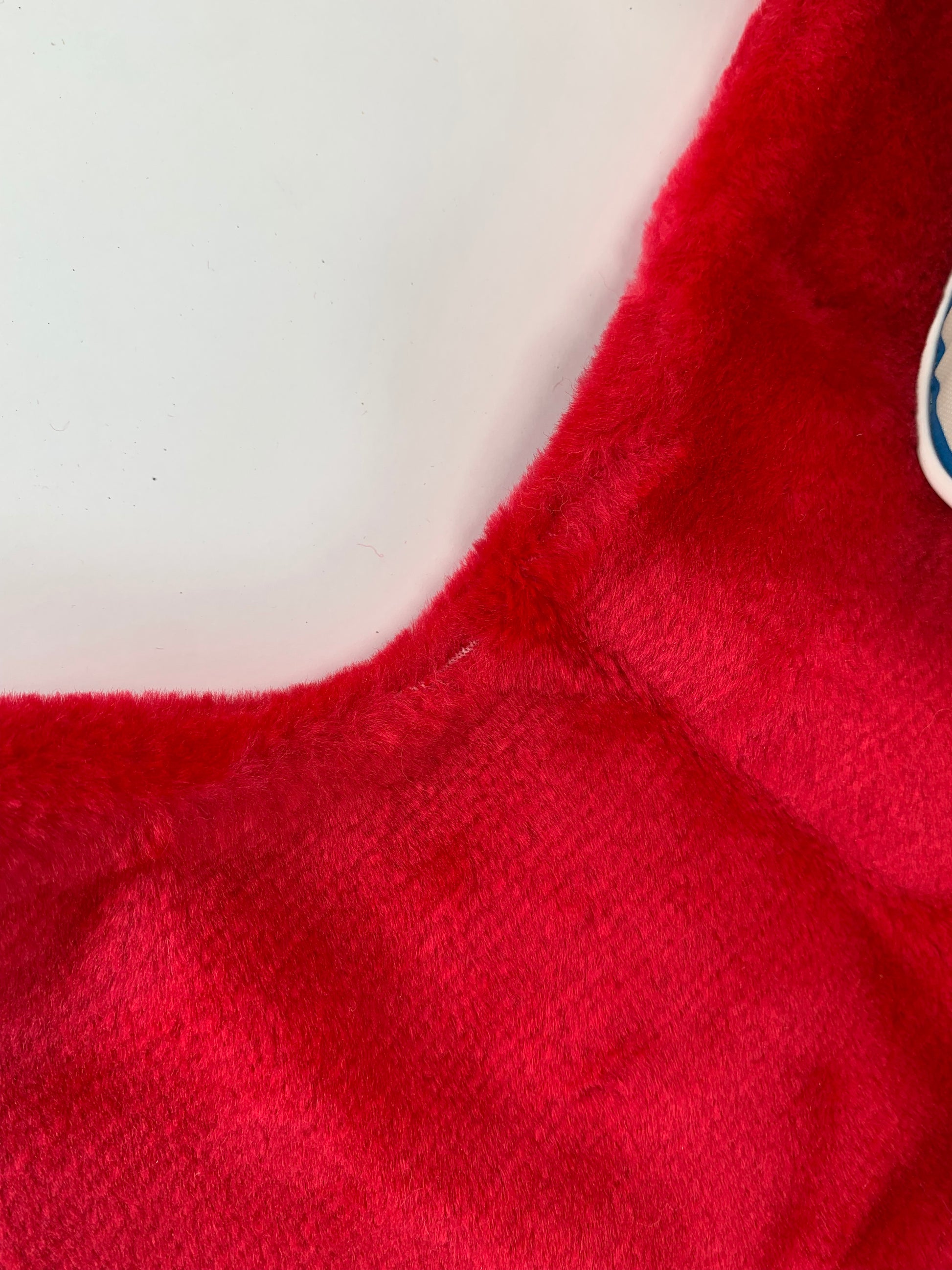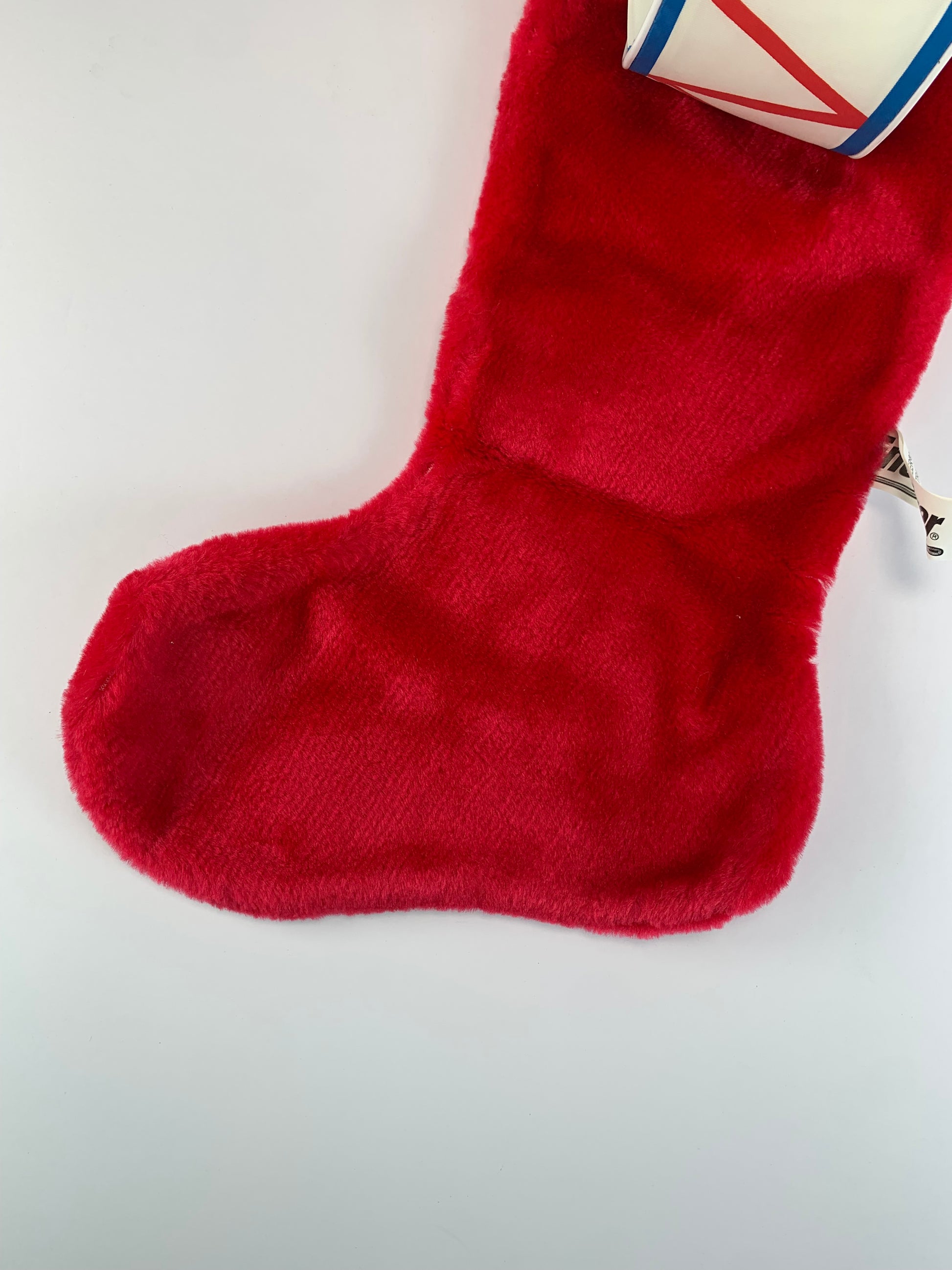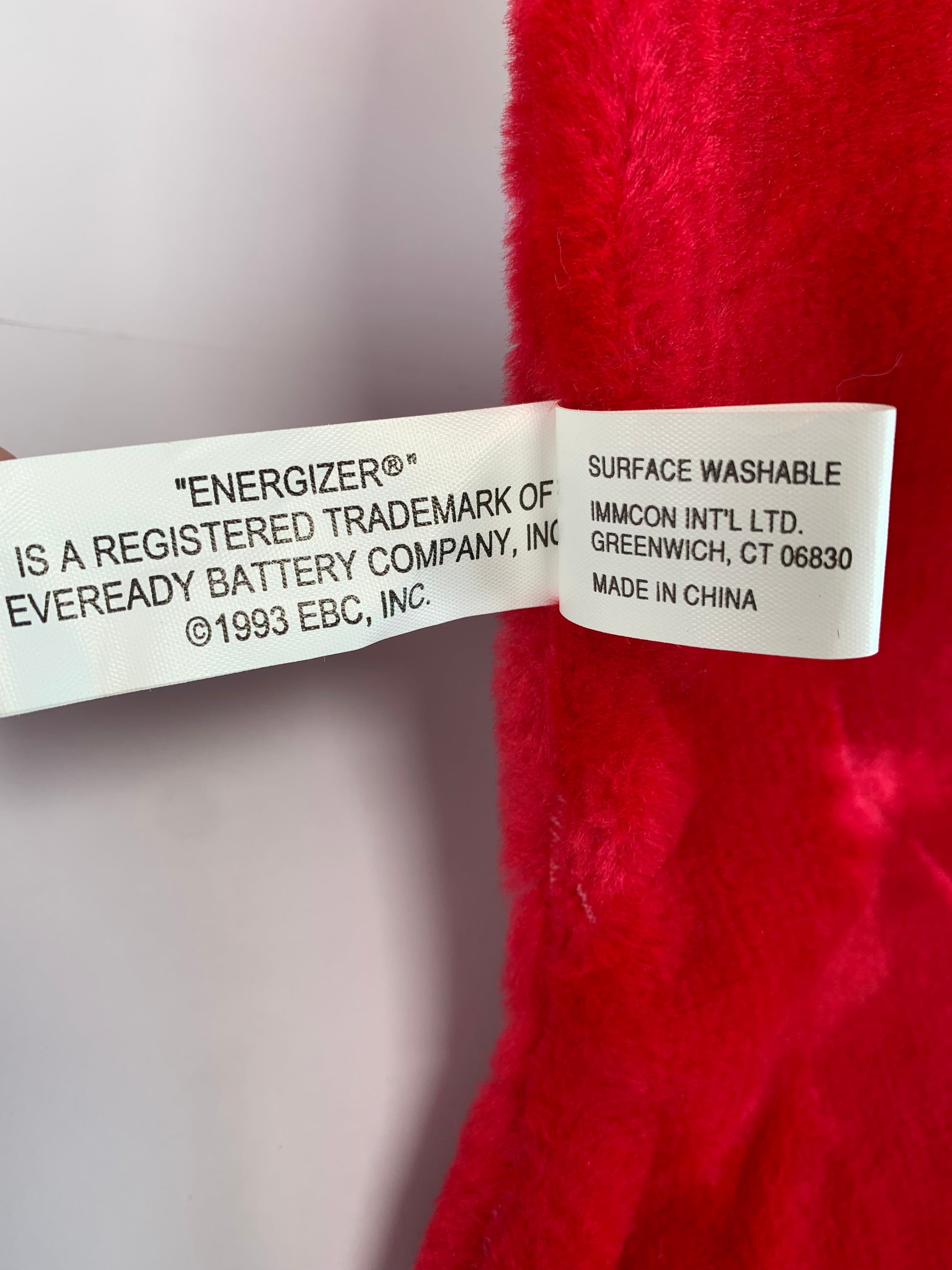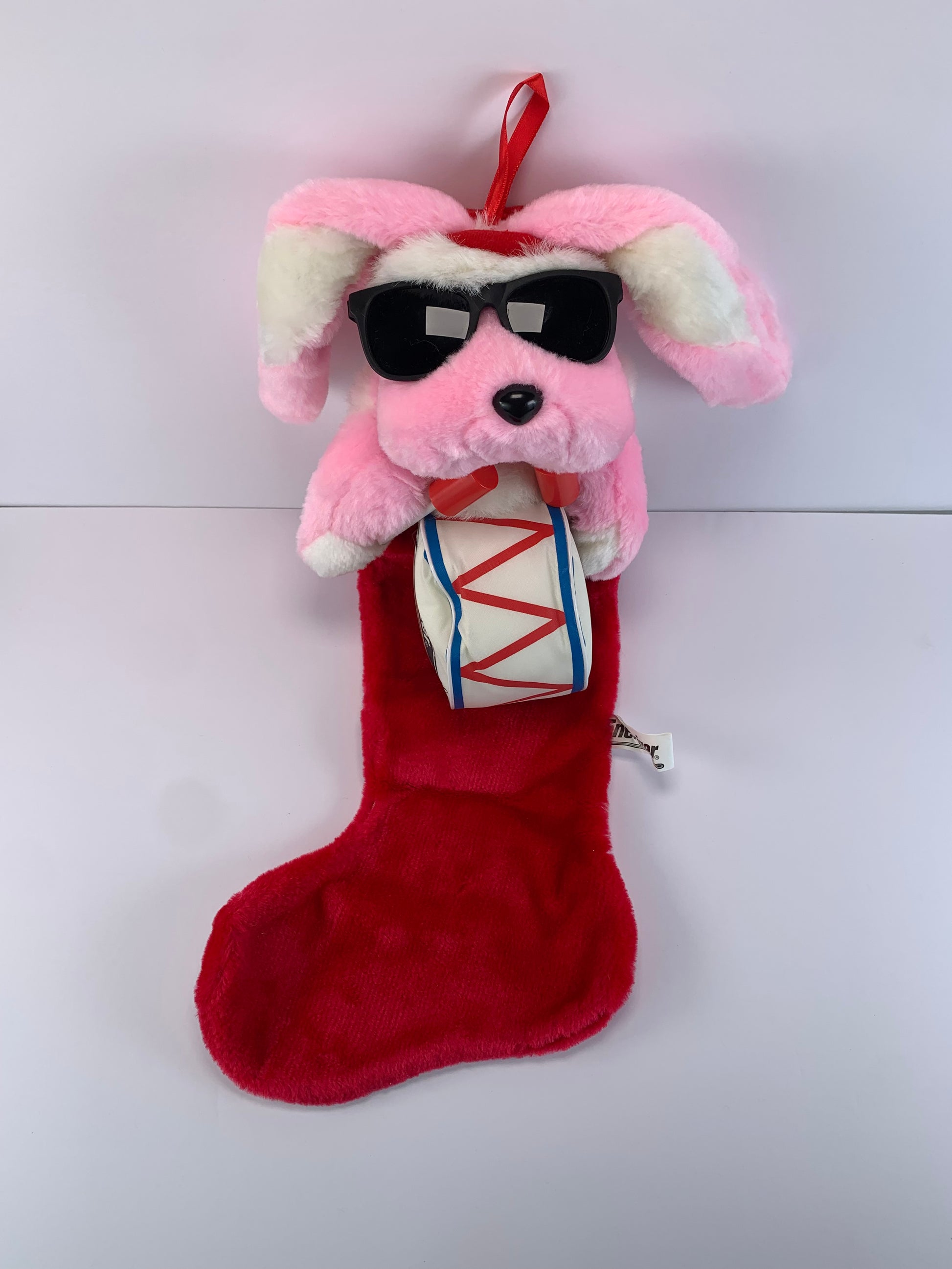 This unique 1993 Christmas stocking features the iconic pink Energizer Bunny in plush detail. A fun and nostalgic piece, it brings classic '90s holiday spirit and a playful twist to seasonal decor. The bunny is decked out in sunglasses, Santa hat, and drums.