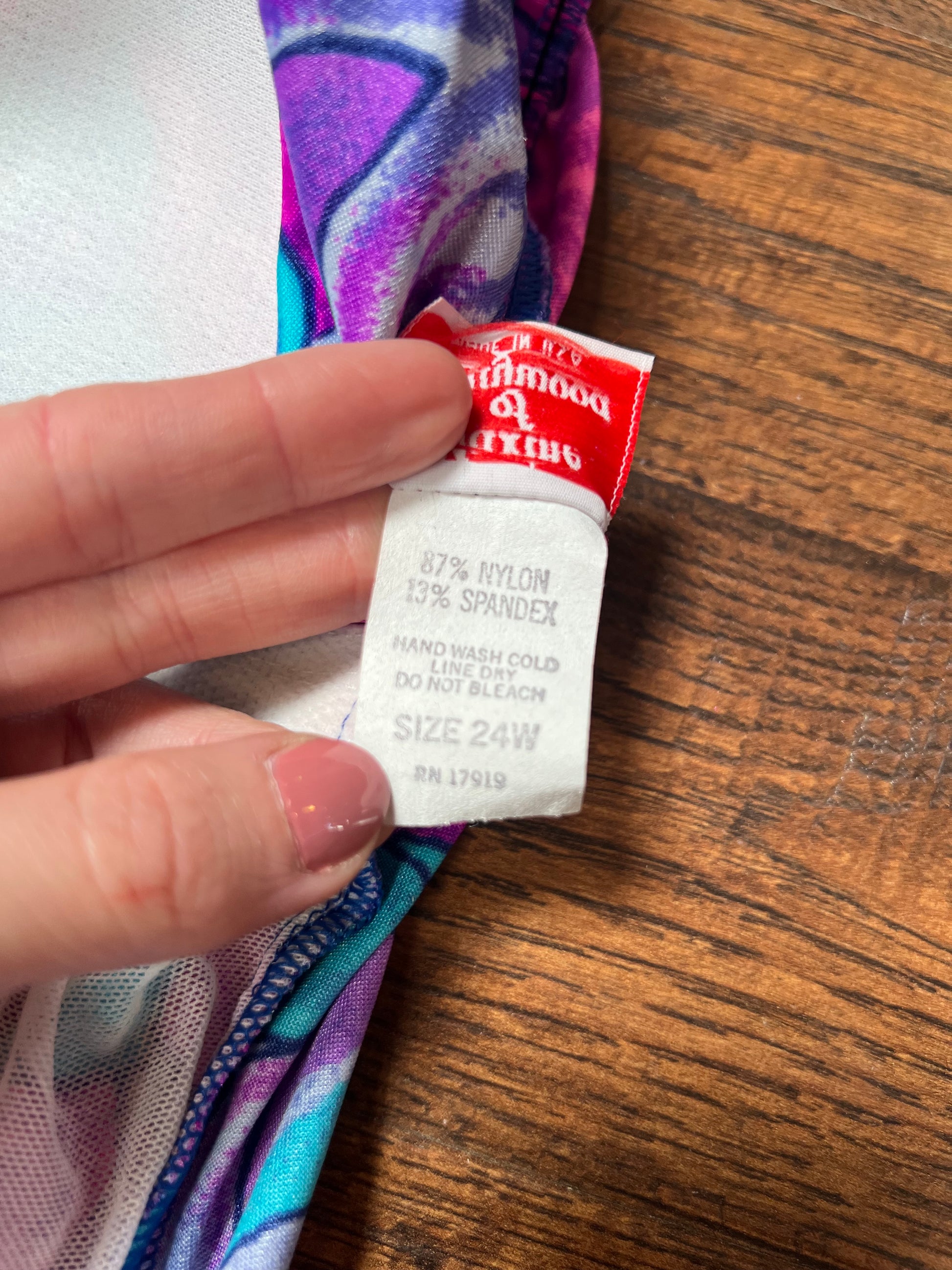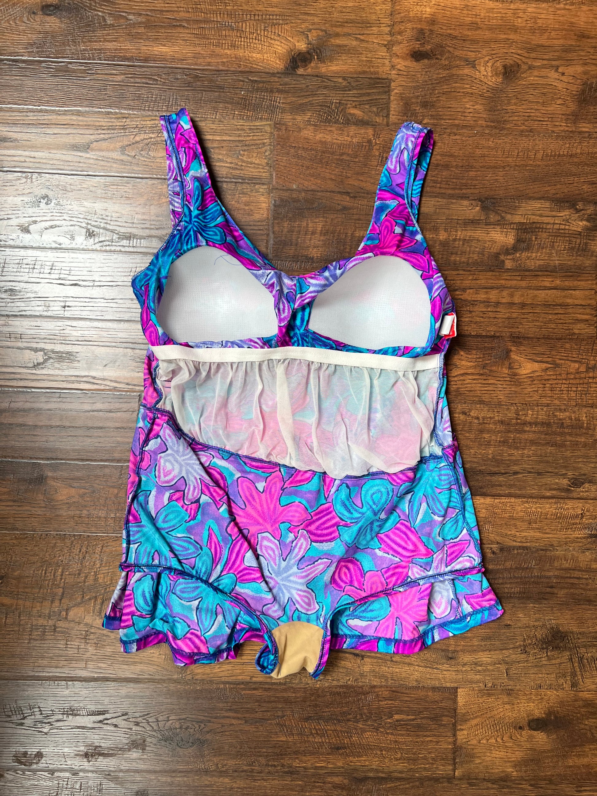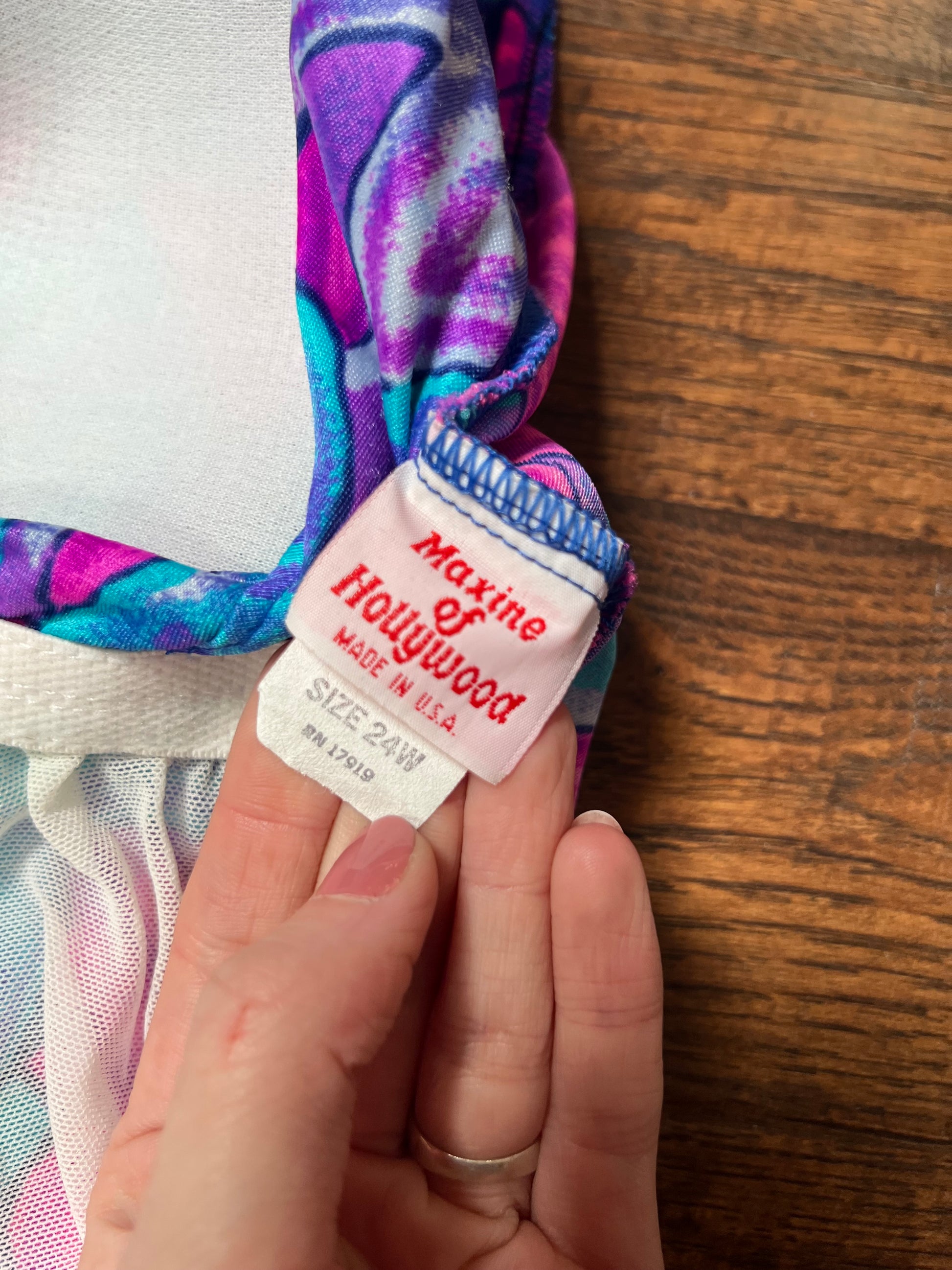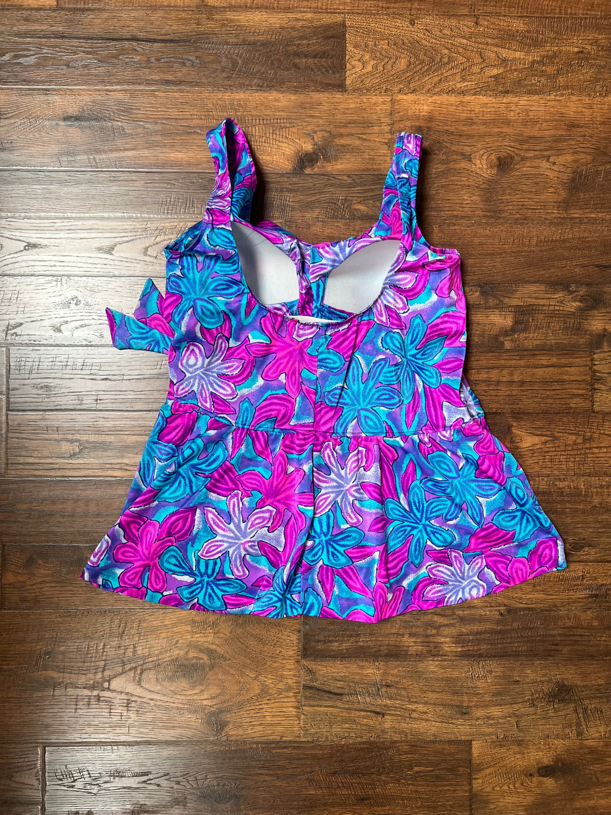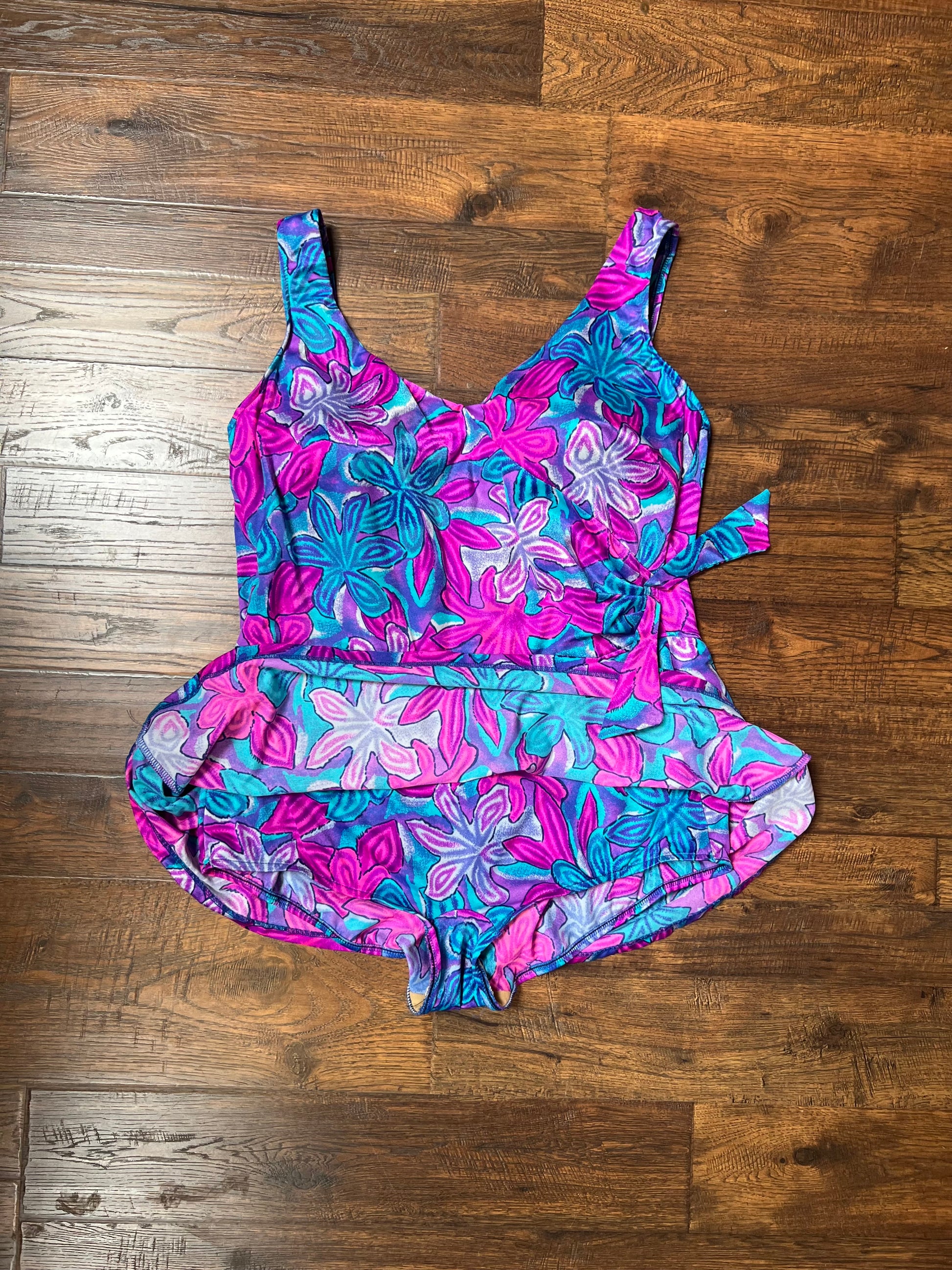 Vintage Clothing - One Piece Swimsuit with Built In Skirt - Blue and Purple Exotic Flowers - Large - Maxine of Hollywood