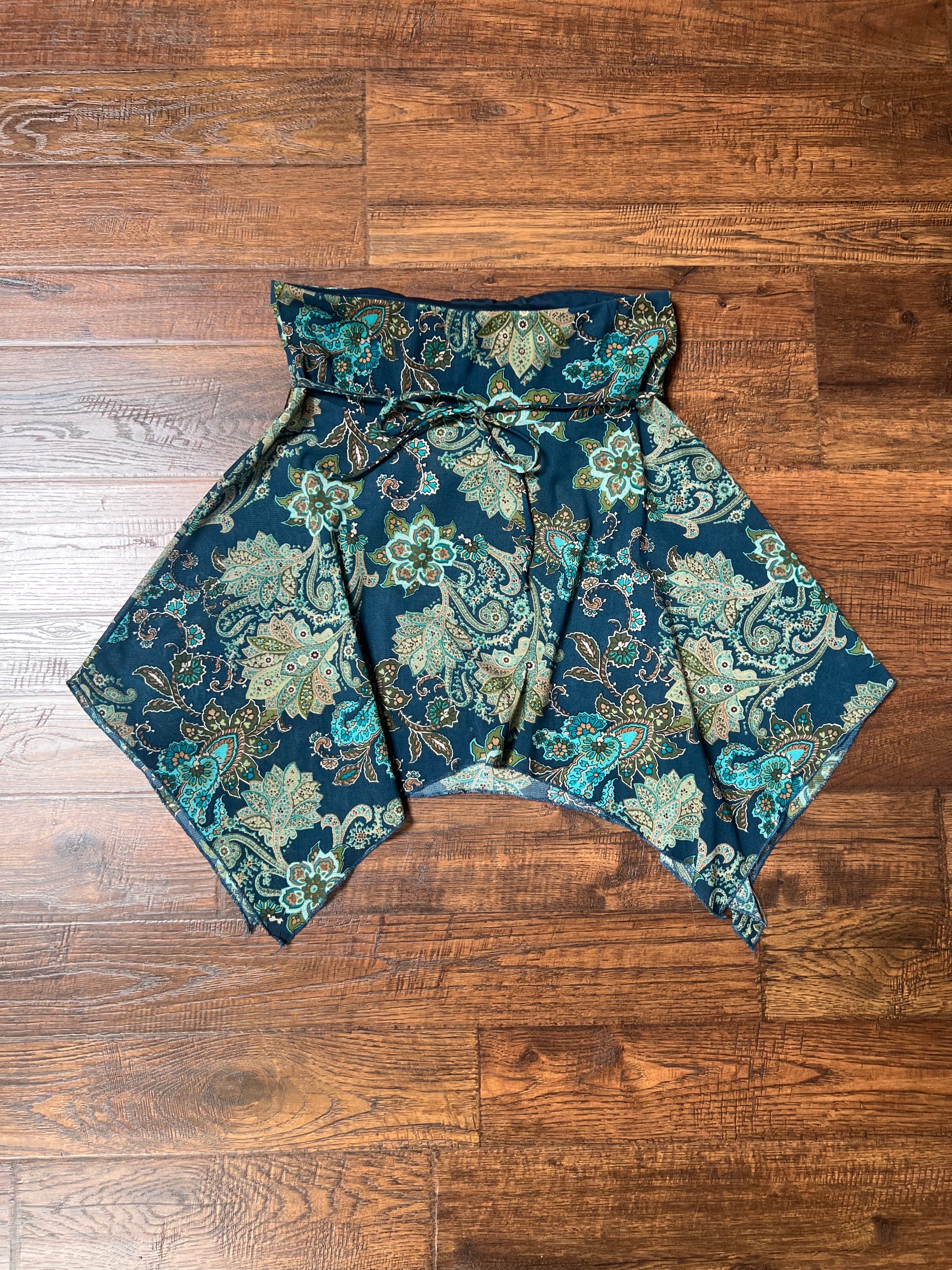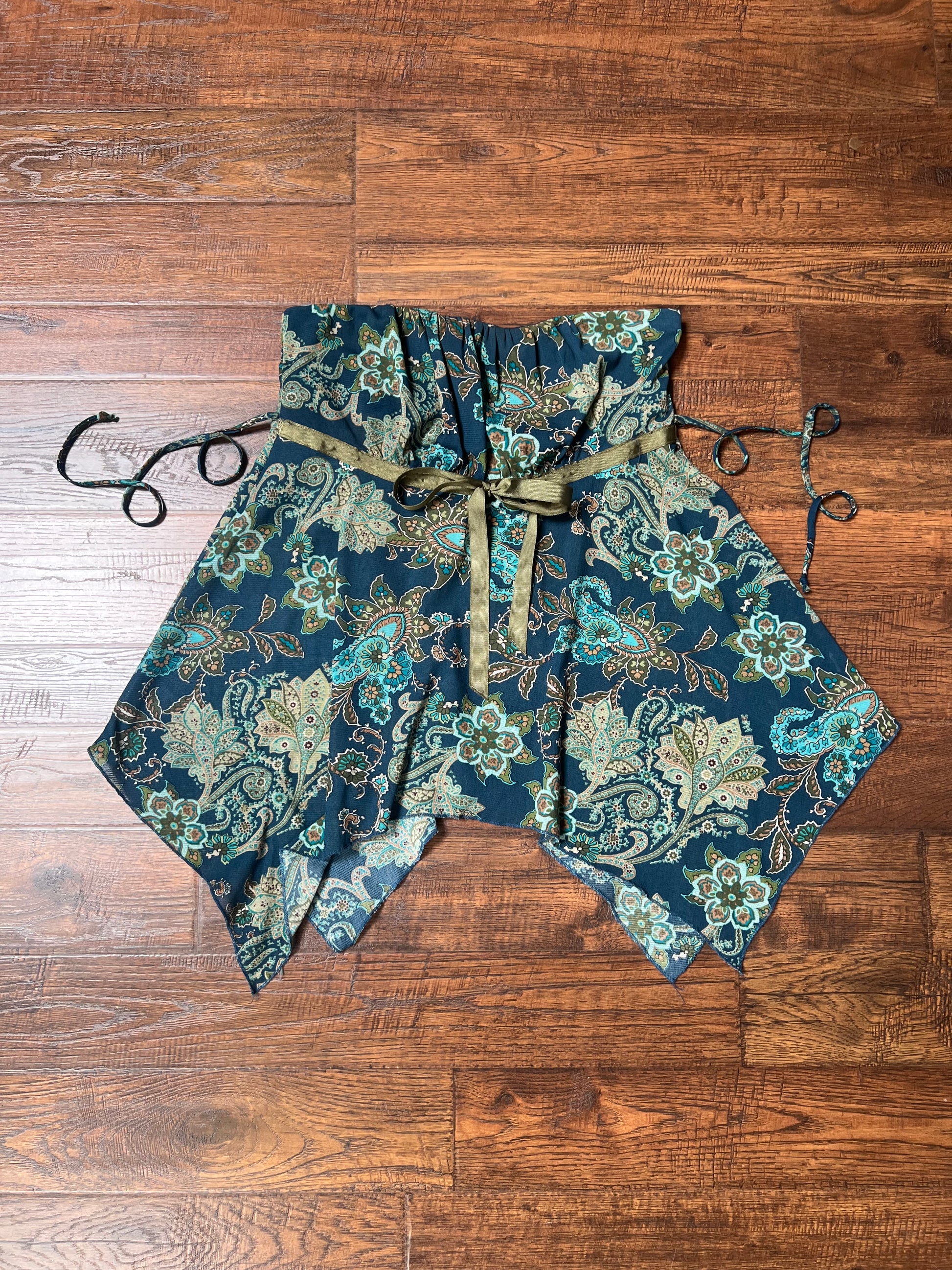 Measures: Bandeau top has plenty of stretch and will fit a 34” - 36” bust, 23” armpit to longest part of the hem. Waist ties are 23.5” long on either side.