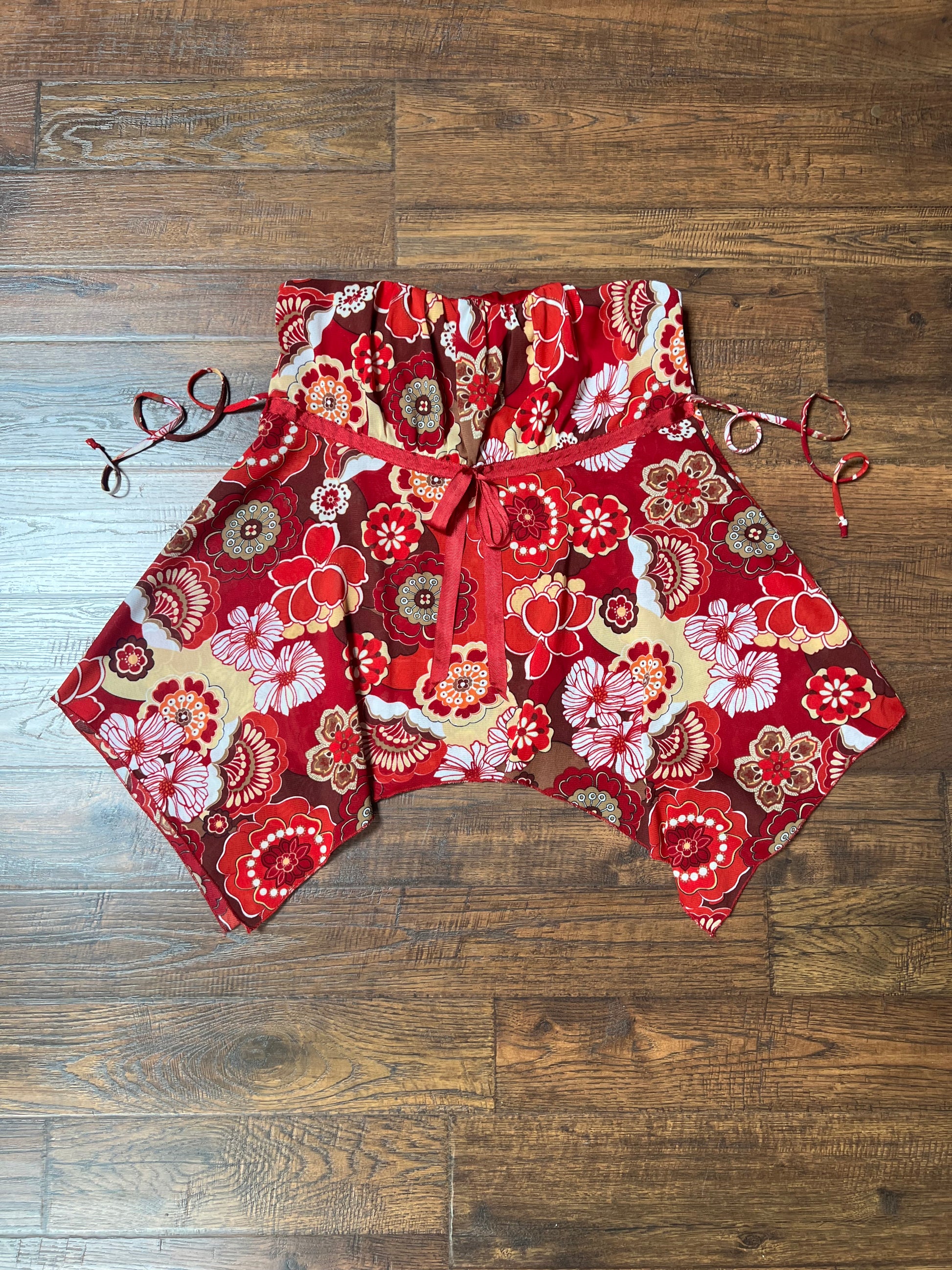 Measures: Bandeau top has plenty of stretch and will fit a 34” - 36” bust, 23” armpit to longest part of the hem. Waist ties are 23.5” long on either side.