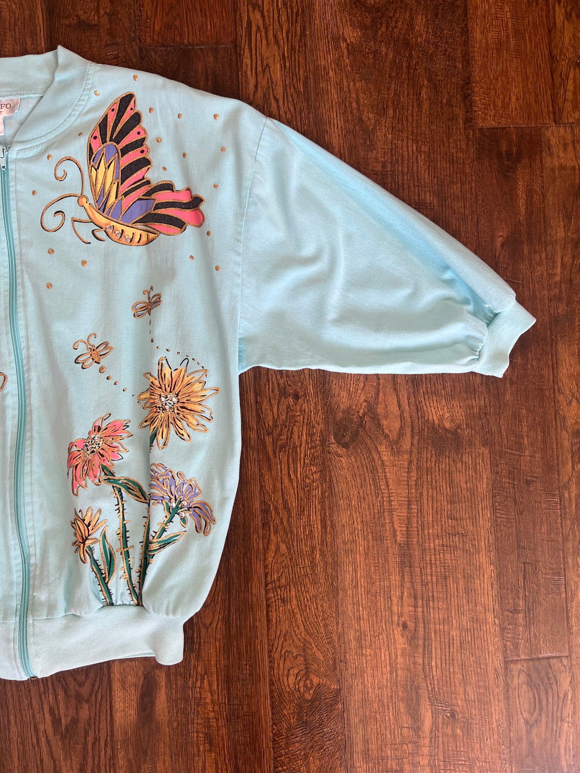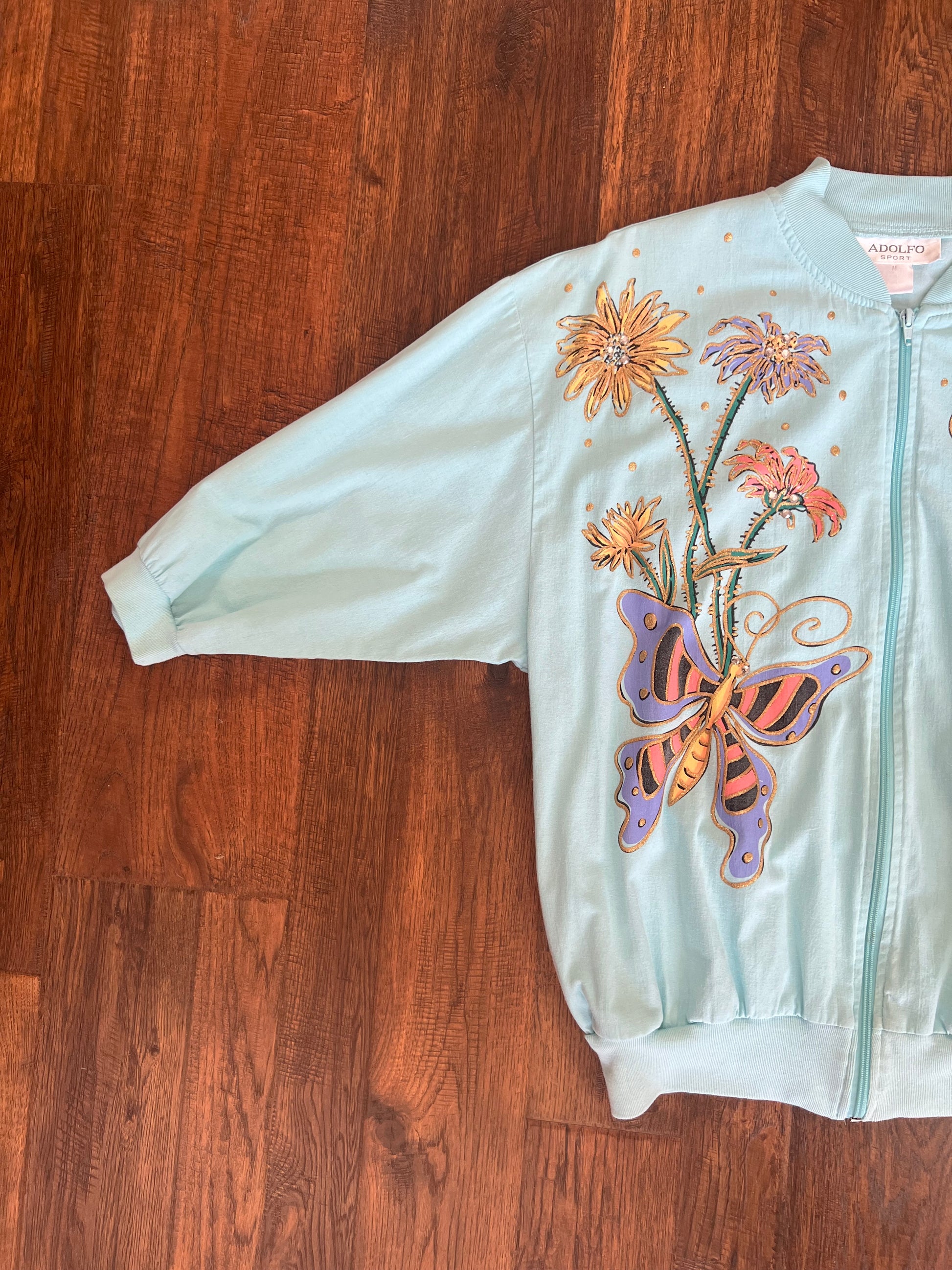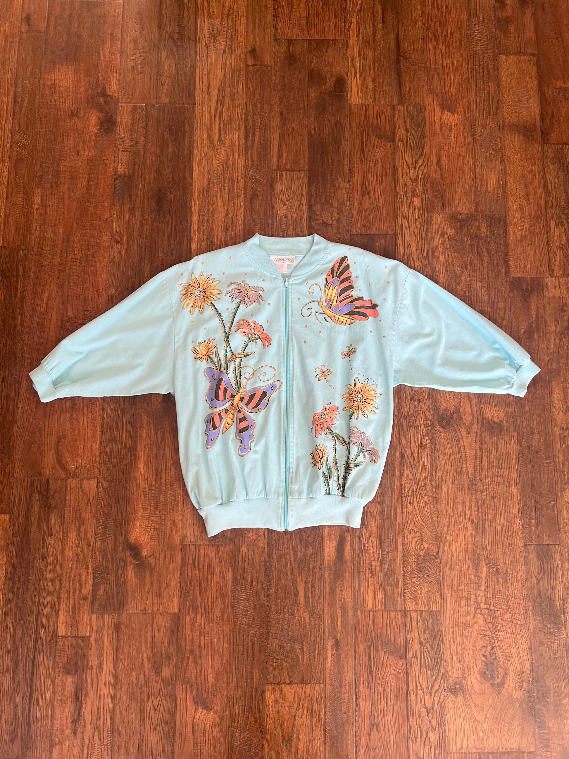 Vintage Clothing - Zip Up Sweatshirt - Wiggy Butterflies & Flowers - Light Blue - Adolfo Sport - Medium