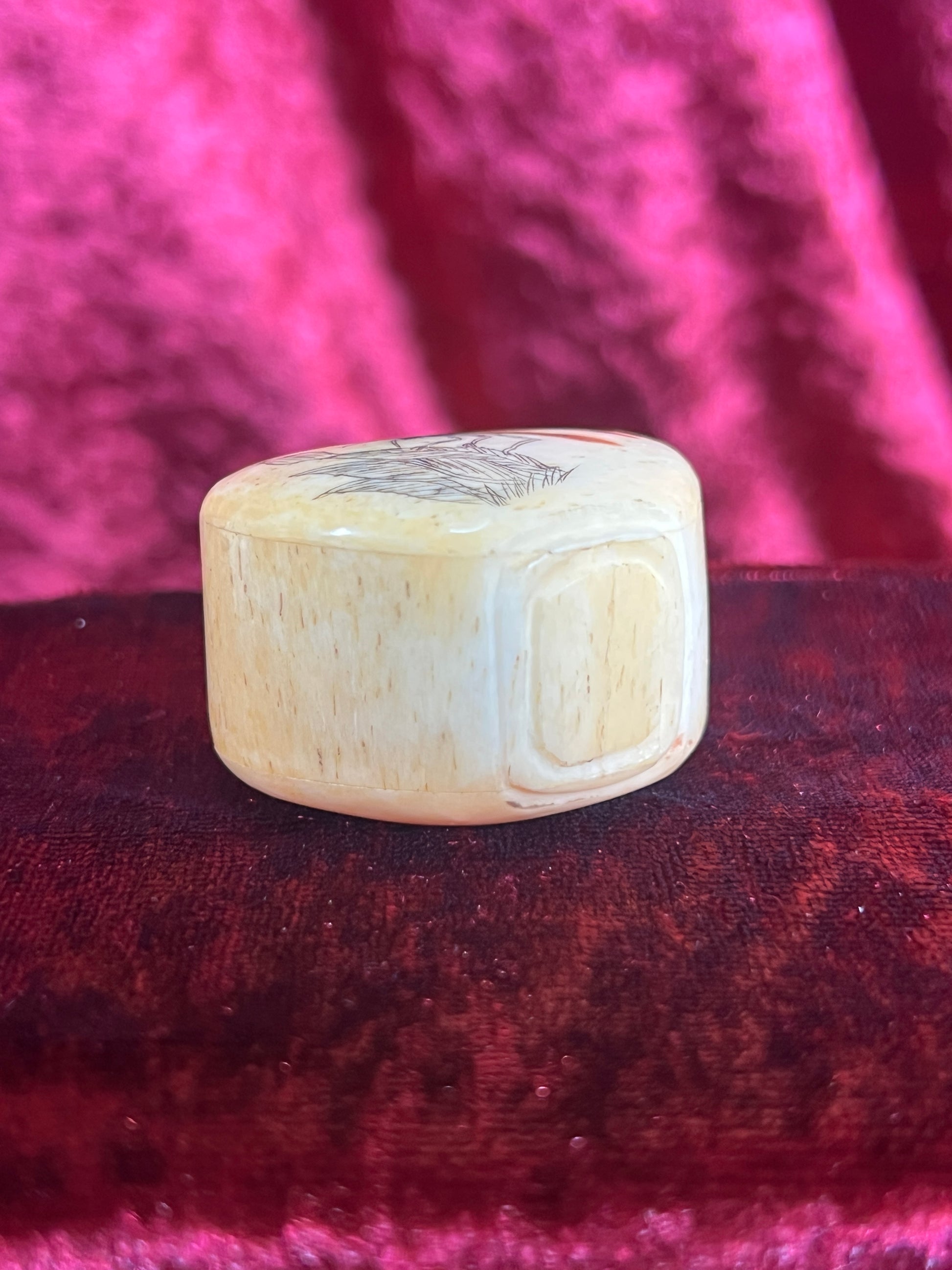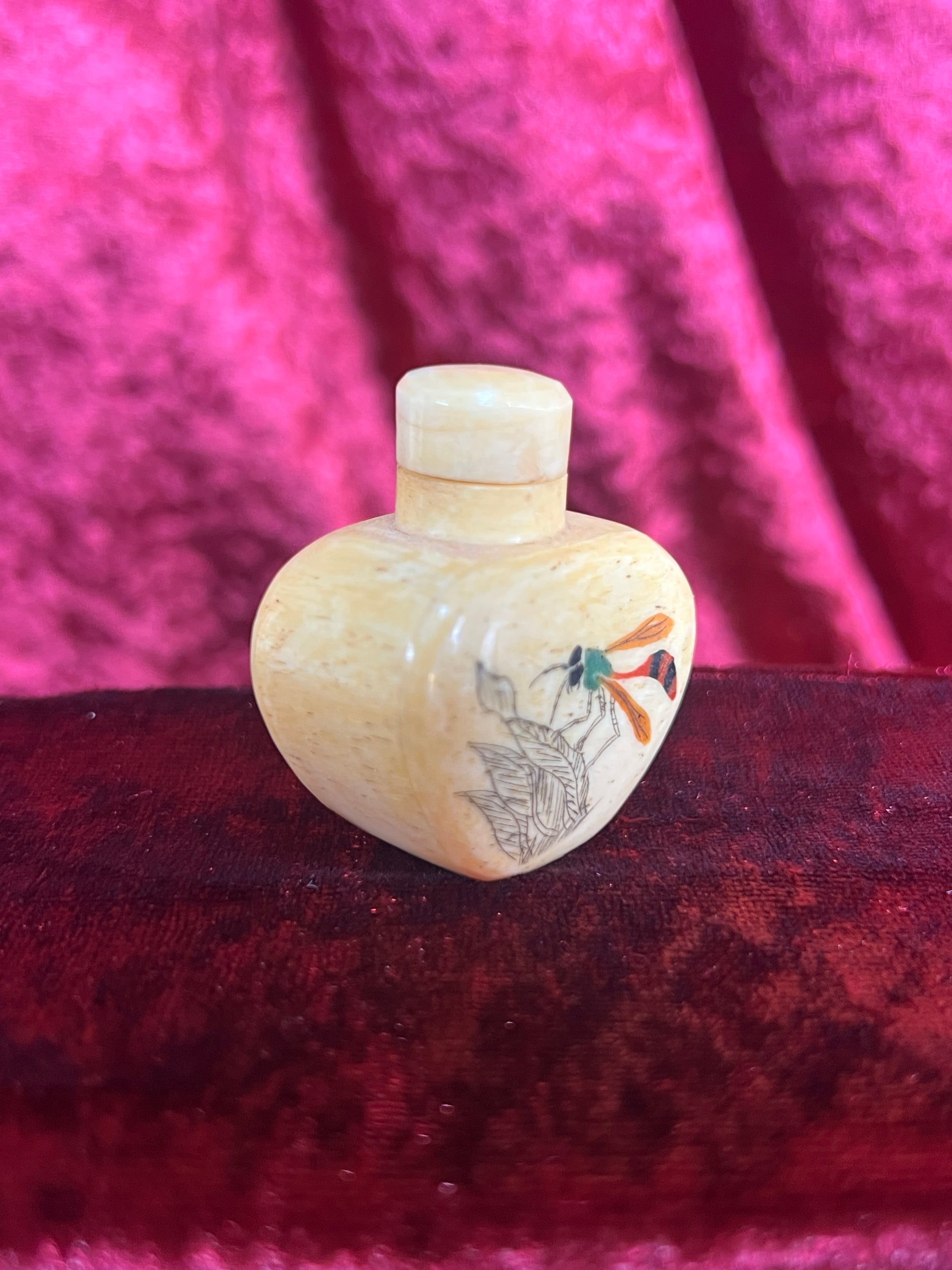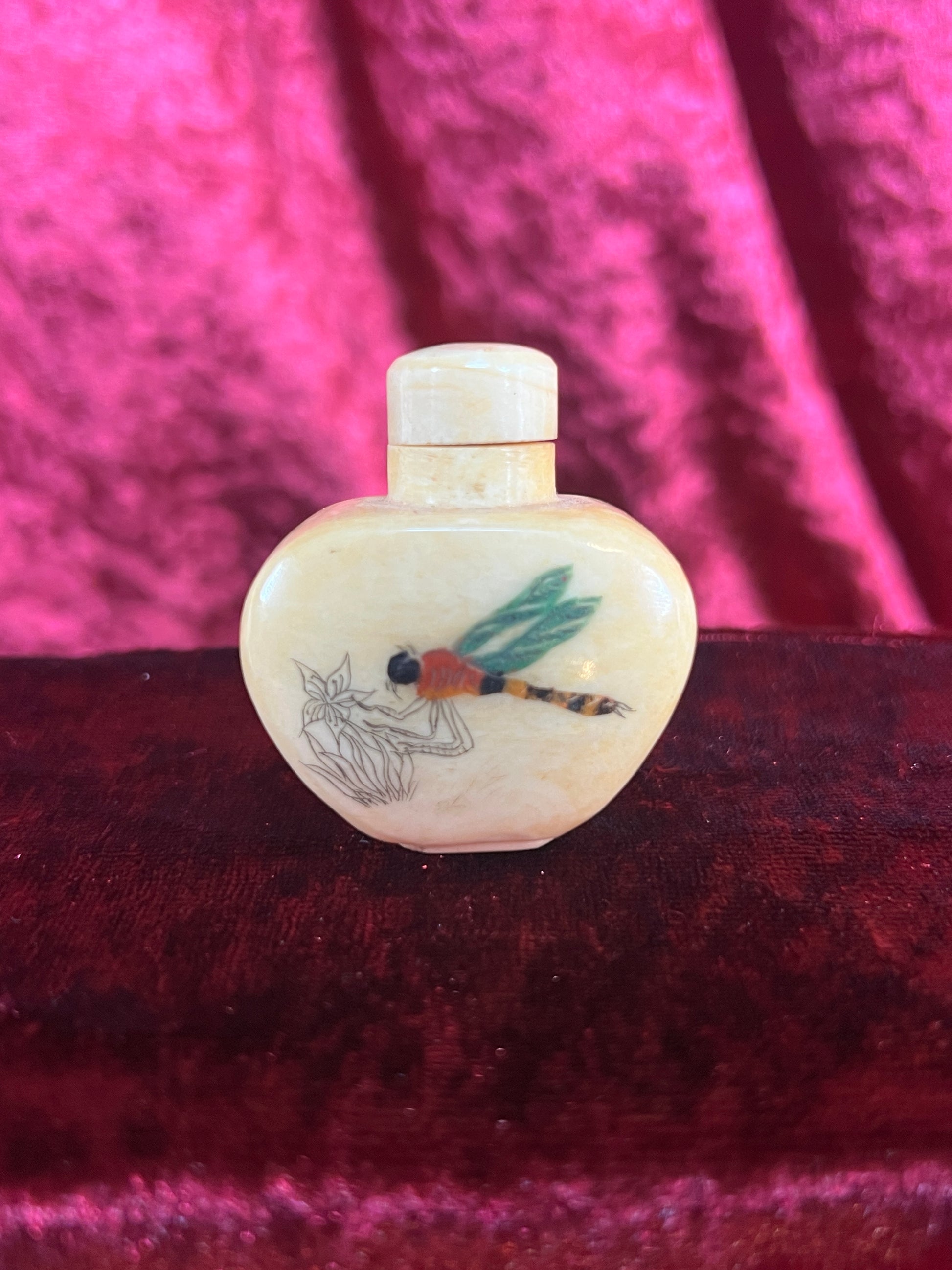 Vintage Curiosities - Antique Snuff Bottle - Bone - Inlaid Dragonfly - 1.75”