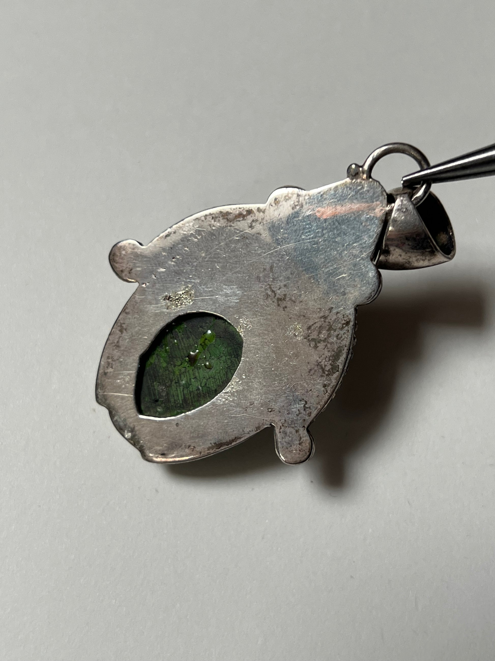 Measures: Pendant is 2 3/8” long from o-ring to bottom. 1 1/2” wide.